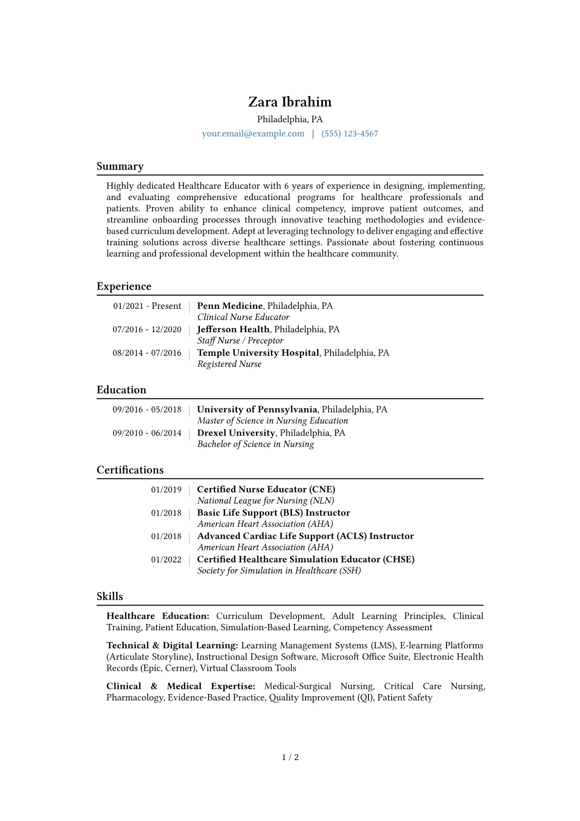 A strong Healthcare Educator resume for a mid-level role effectively showcases contributions to clinical competency and patient safety. Hiring managers prioritize achievements demonstrating improved educational outcomes, such as quantified increases in staff proficiency or reductions in medication errors. Key elements include experience with curriculum development, adult learning methodologies, and simulation training. Certifications like CNE (Certified Nurse Educator) or BLS/ACLS Instructor credentials are vital, alongside familiarity with EBP (Evidence-Based Practice) and Quality Improvement initiatives. Effective resumes will highlight impact on care delivery and regulatory compliance through education.