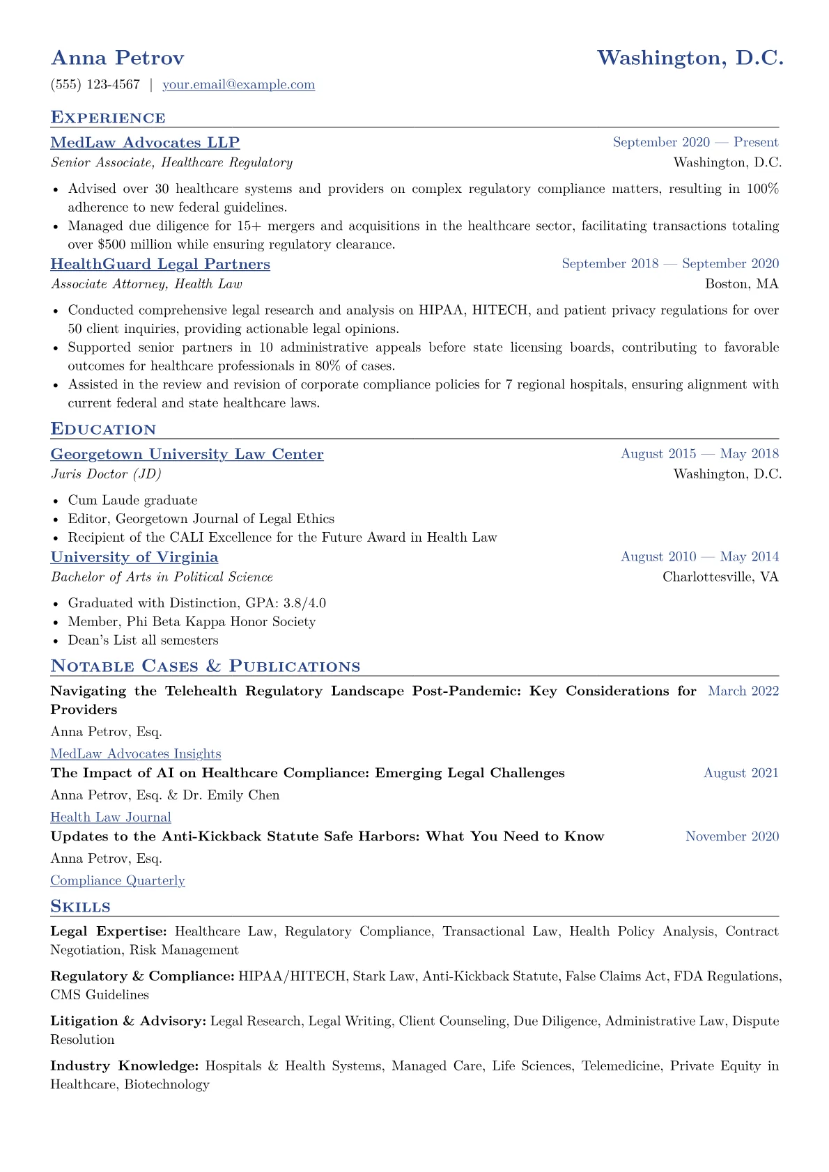 This particular resume example excels by featuring quantified achievements that clearly articulate the impact of legal work, such as "negotiated 20+ physician employment agreements" or "conducted compliance audits for 3 major healthcare systems." Its thoughtful skills grouping effectively separates regulatory, transactional, and litigation competencies, while prominently displaying certifications like CHC or CCEP immediately signals specialized, relevant credentials to recruiters.