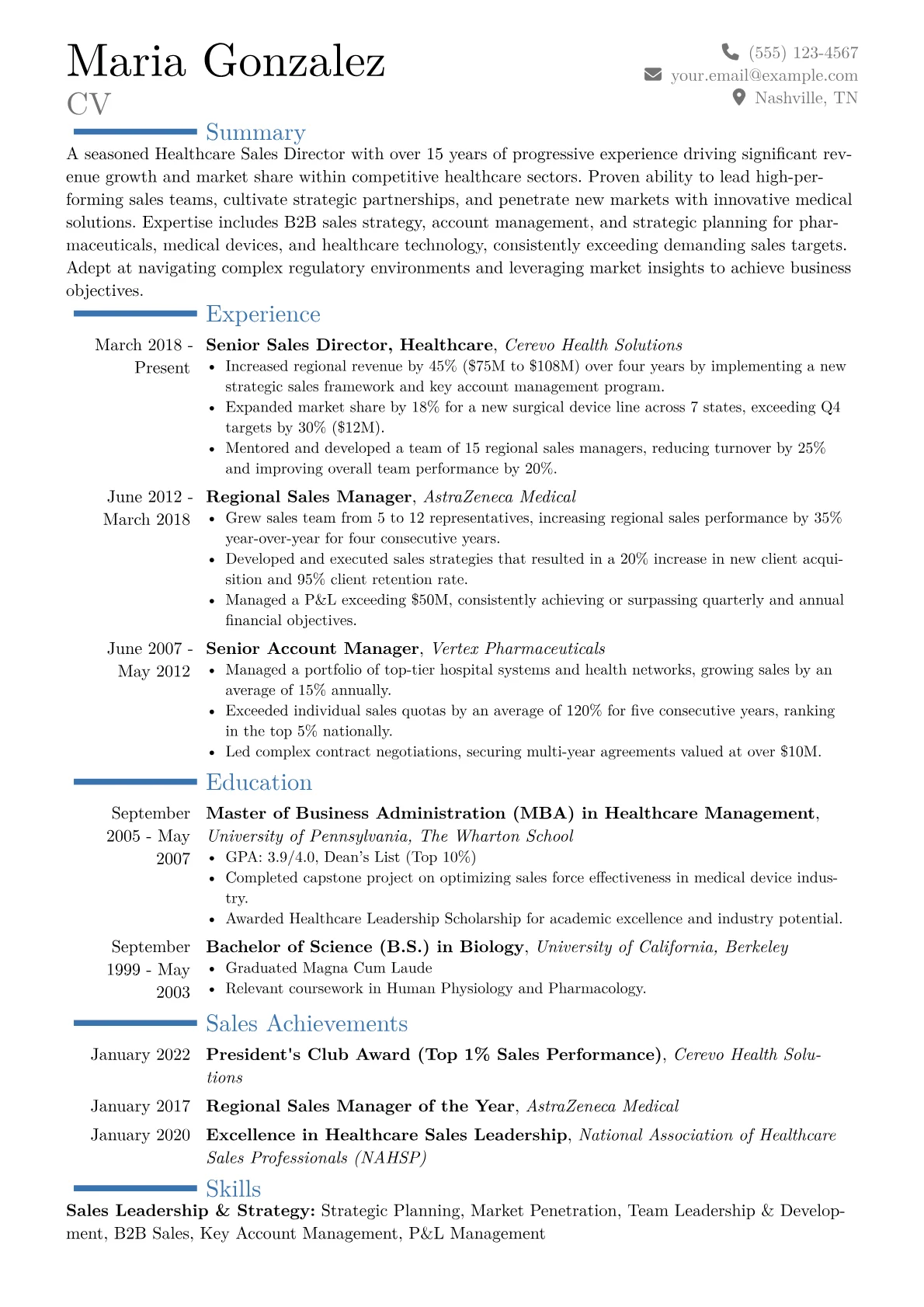 The example resume effectively highlights these critical elements. Its structure groups relevant skills under specific headings such as "Strategic Account Management" and "Team Leadership & Development," making it easy for recruiters to scan. Achievements are meticulously quantified, showcasing precise revenue growth figures, new product launches, and the successful recruitment and mentoring of high-performing sales teams. Furthermore, the resume appropriately features specific industry tools and certifications, like Salesforce or Veeva proficiency and relevant sales methodology training, reinforcing a candidate's readiness for executive sales leadership in healthcare.