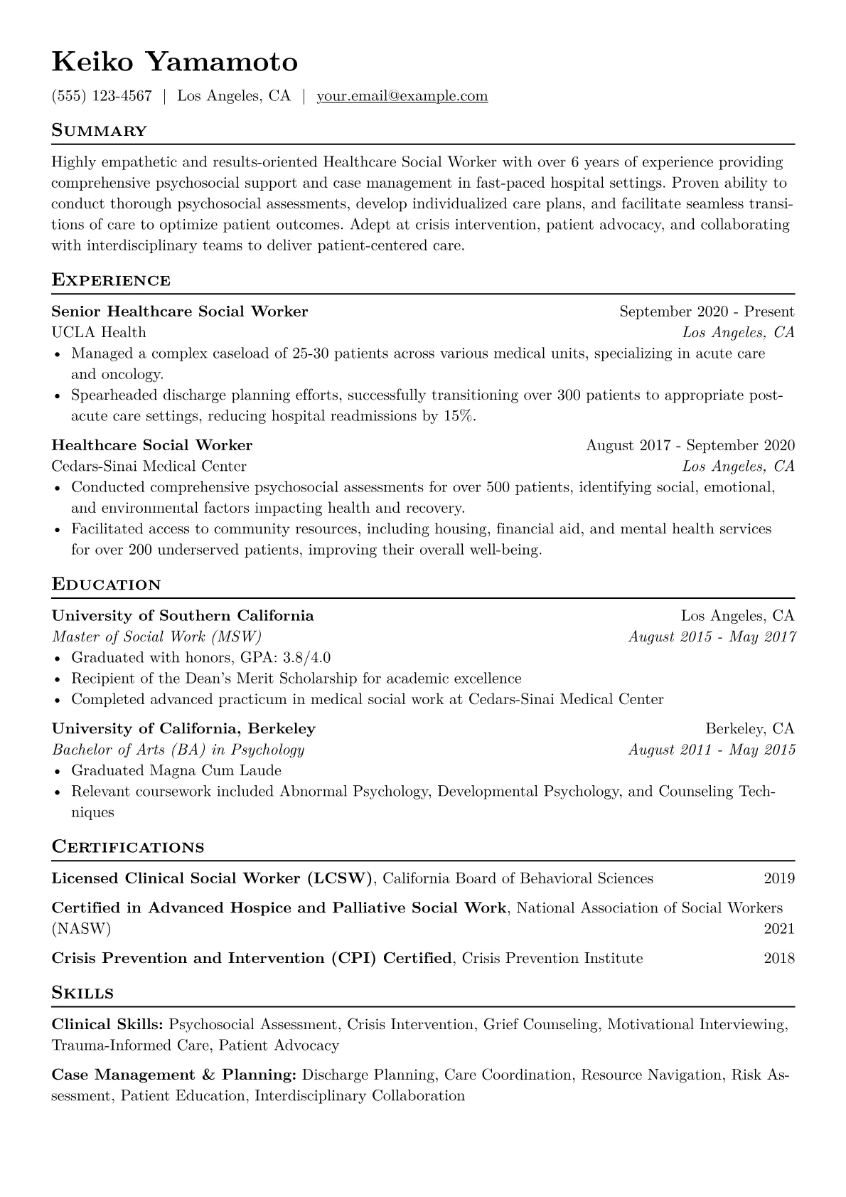 This example CV effectively showcases these priorities. Achievements are precisely quantified, such as "reduced readmission rates by 15% through proactive discharge planning" or "managed a daily caseload of 10-12 patients in an acute care setting." Skills are thoughtfully grouped into categories like 'Clinical Assessment,' 'Care Coordination,' and 'Crisis Intervention,' making expertise immediately clear. Key certifications and proficiency with specific healthcare software, like Epic or Cerner, are prominently highlighted, reinforcing industry readiness.
