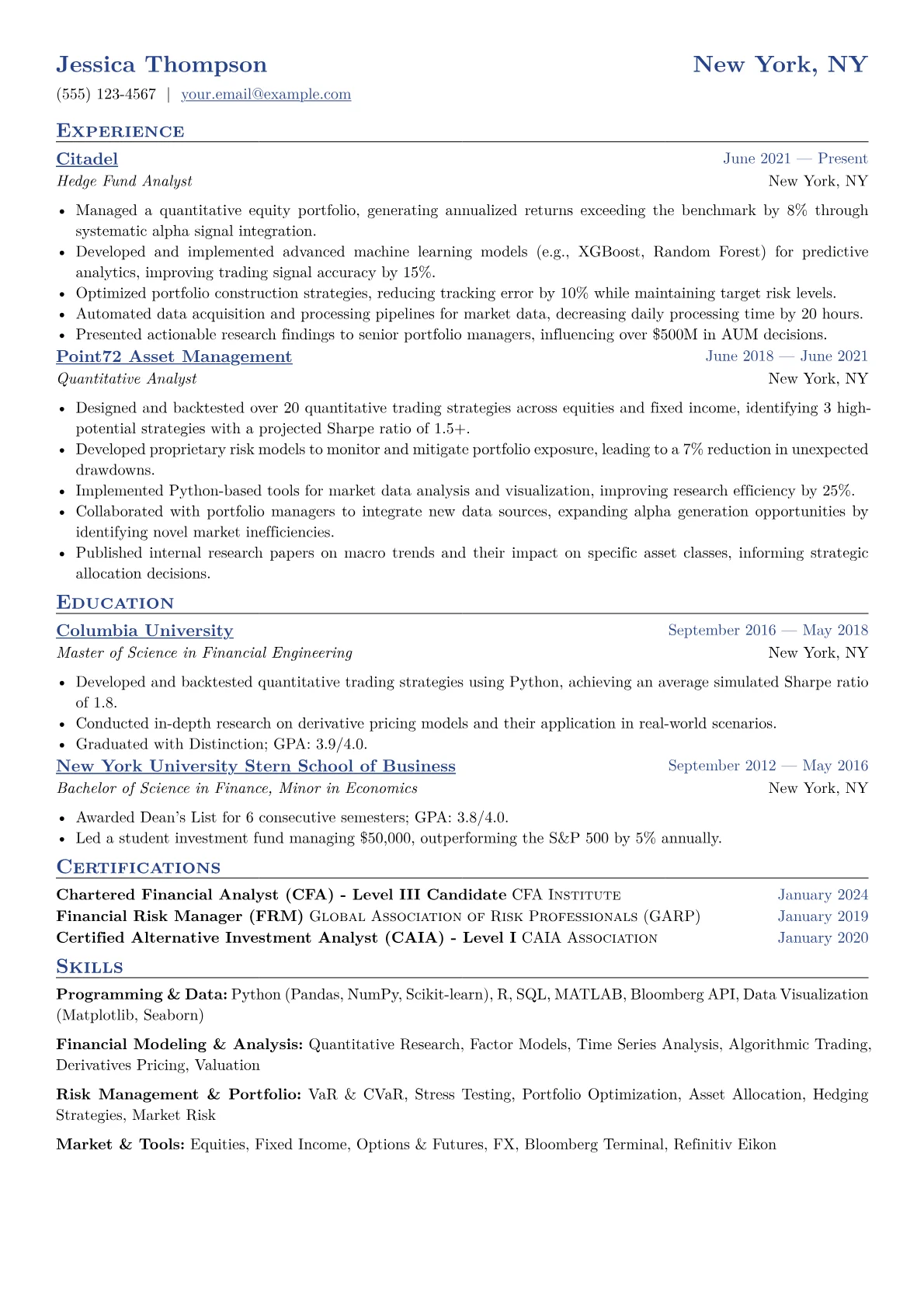 This JobSprout example excels by prominently featuring quantified achievements, showcasing direct contributions like "increased AUM by X%" or "outperformed benchmark by Y%." It effectively groups relevant certifications, such as CFA, and clearly outlines specific skills like derivative analysis or Bloomberg terminal proficiency, immediately highlighting a candidate's value. These structural choices provide immediate insight into a candidate's capabilities.