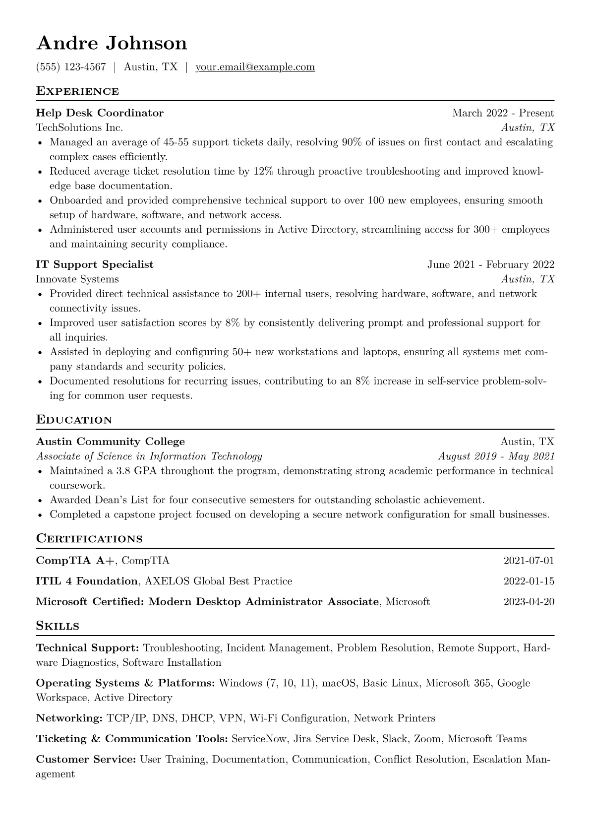 This impactful template was designed using JobSprout and can be readily remixed to create your own standout Help Desk Coordinator resume.