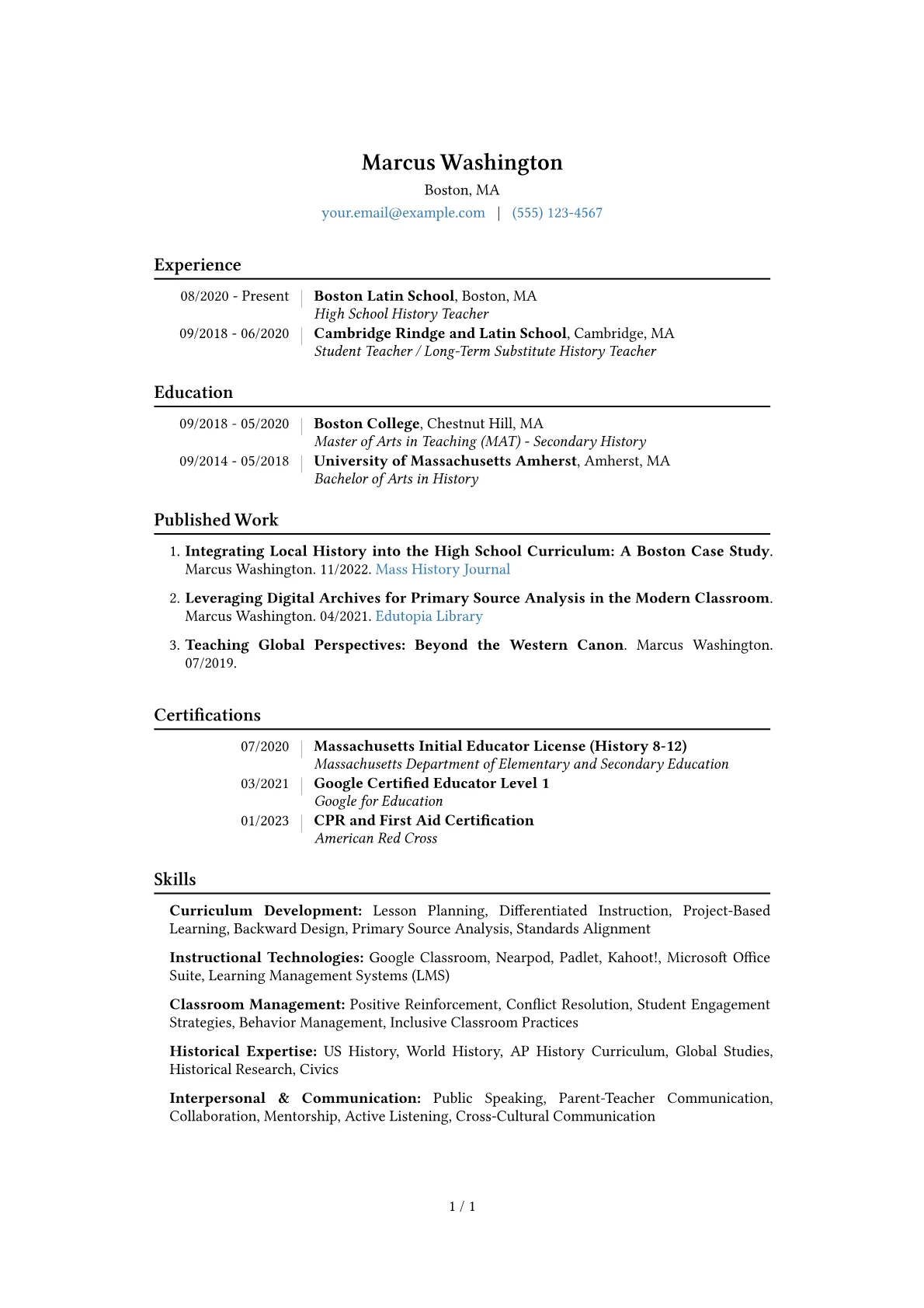 This example excels by strategically using quantified achievements, such as increasing student participation in historical simulations or improving research project scores, which clearly illustrate a candidate's success. It prominently features relevant certifications like AP History or specific pedagogical training, alongside a well-organized skills section grouping areas like curriculum design, differentiated instruction, and historical research. These elements collectively present a well-rounded and impactful profile.