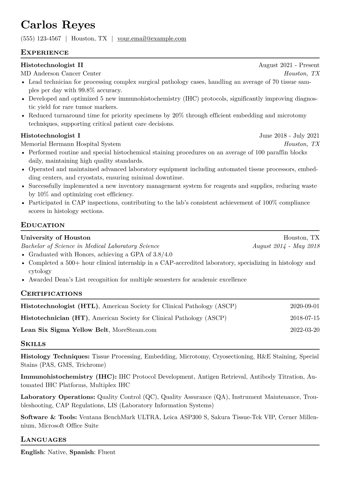 This effective template was expertly built using JobSprout’s professional tools. You can easily remix and customize it to create your own outstanding Histotechnologist resume, tailored to your unique career journey.