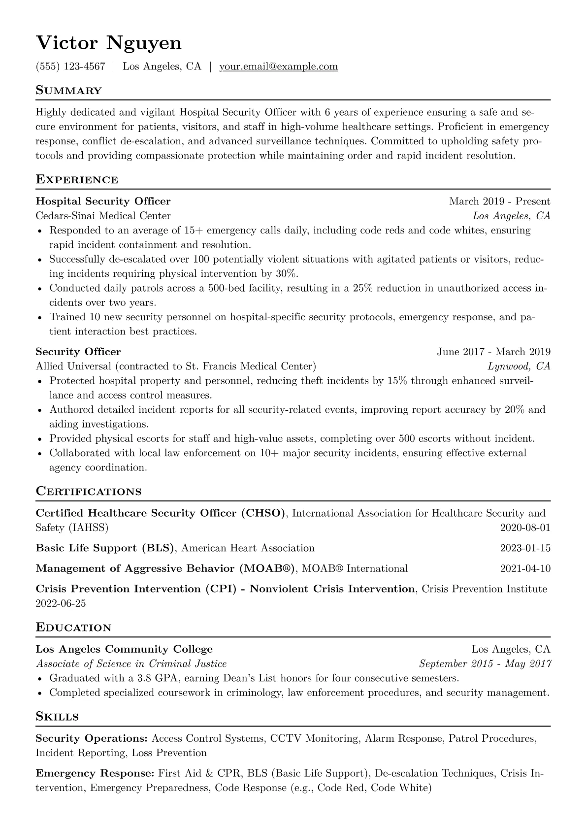 This template was built with JobSprout and can be remixed to create your own tailored Hospital Security Officer resume. It provides a robust framework for highlighting your specific skills and experience effectively.