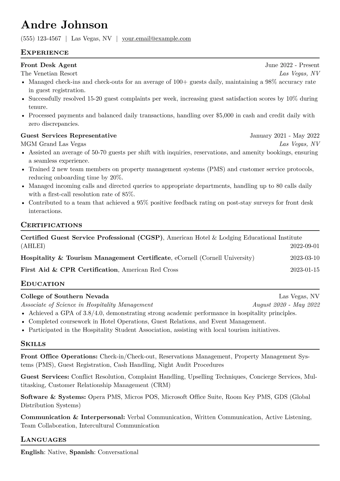 This example effectively highlights key qualifications through its well-structured skills grouping, separating areas like "Guest Relations" and "Operations Management." The inclusion of relevant certifications, such as hospitality software proficiency, further strengthens its appeal. Quantified achievements, even for an entry-level professional, clearly articulate impact, like managing a specific number of check-ins daily or contributing to positive guest feedback, making the candidate's value immediately clear.
