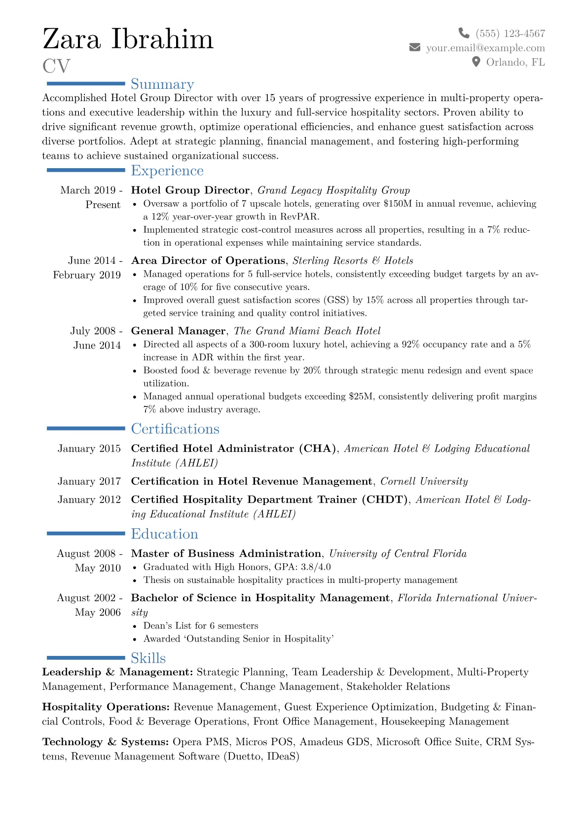 The JobSprout resume example for a Hotel Group Director effectively showcases these critical elements. It excels at quantifying achievements, such as "increased average daily rate by 15% across five diverse properties" or "reduced operational costs by $2M through vendor renegotiations." Skills are thoughtfully grouped into categories like "Strategic Portfolio Management," "Financial Acumen," and "Digital Transformation," making them easy to digest. Specific certifications such as Certified Hotel Administrator (CHA) and proficiencies in revenue management systems like Duetto or property management systems like Opera are prominently featured, signaling a command of industry-specific tools and credentials.