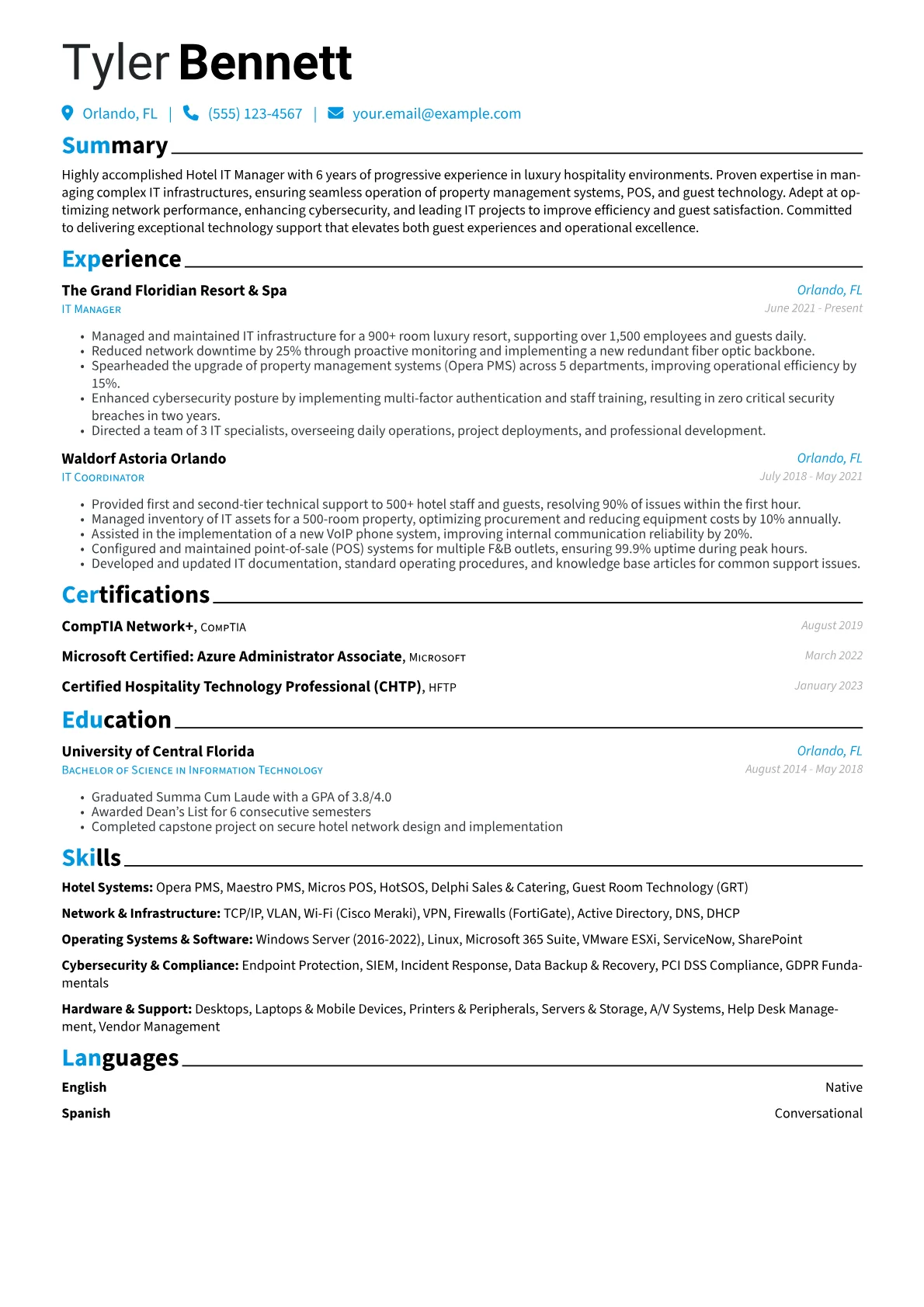 The JobSprout example excels by quantifying accomplishments. For instance, it details "reduced system outages by 15% through proactive monitoring" rather than vague duties. Skills are clearly categorized, separating core technical abilities (network administration, cybersecurity, VoIP) from essential soft skills like vendor negotiation and guest-facing support. Specific tools and platforms relevant to hospitality IT, such as property management systems, point of sale solutions, and network security appliances, are prominently listed. This showcases immediate readiness for typical hotel IT environments.