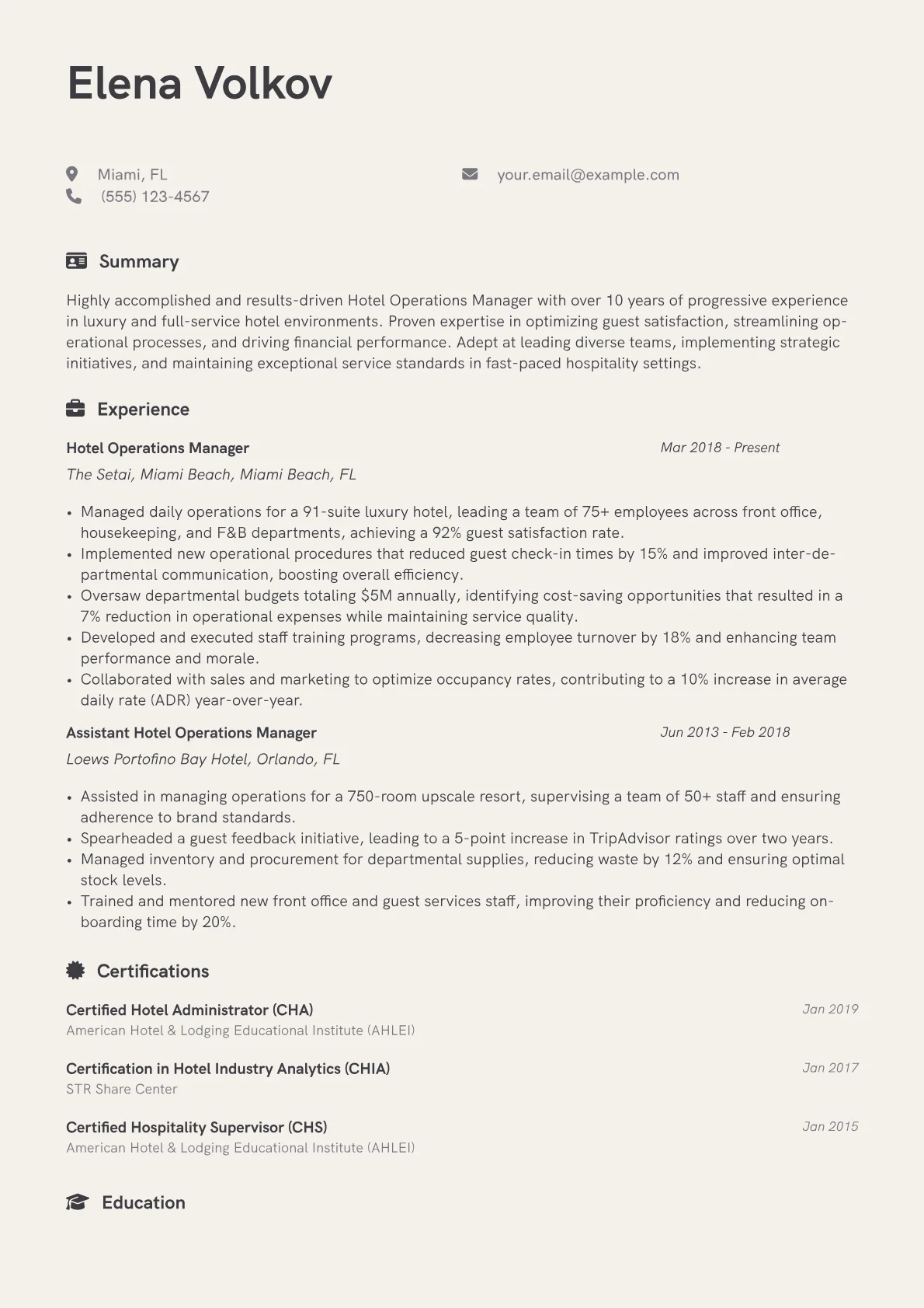 For a Hotel Operations Manager, especially one with 8-12 years of experience, a resume must highlight strategic oversight and tangible impact. Hiring managers seek evidence of successful P&L management, consistent improvements in guest satisfaction scores (GSS), and robust staff development initiatives. The role demands balancing meticulous daily operations with long-term strategic planning, often navigating fluctuating market demands and diverse team management across departments like front office, housekeeping, and F&B. Key achievements include reducing operational costs by specific percentages, increasing RevPAR, or implementing efficiency-driving technologies. Mentioning relevant certifications, such as a Certified Hotel Administrator (CHA), or specific system proficiencies like Opera PMS, demonstrates industry-specific expertise.