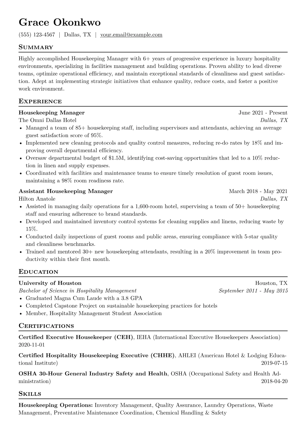 This template was built with JobSprout and can be remixed to create your own tailored Housekeeping Manager resume. Craft your professional story with confidence and precision.