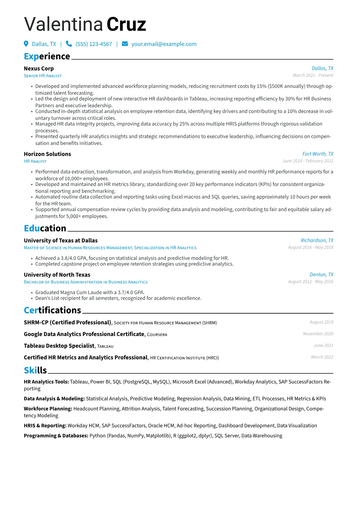 This example resume excels by prominently featuring quantified achievements, such as "optimized onboarding processes, reducing new hire ramp-up time by 15%." It thoughtfully groups technical and analytical skills, highlighting expertise in HRIS systems and data visualization tools crucial for the role. The inclusion of relevant certifications further solidifies the candidate's professional credibility and specialized knowledge.