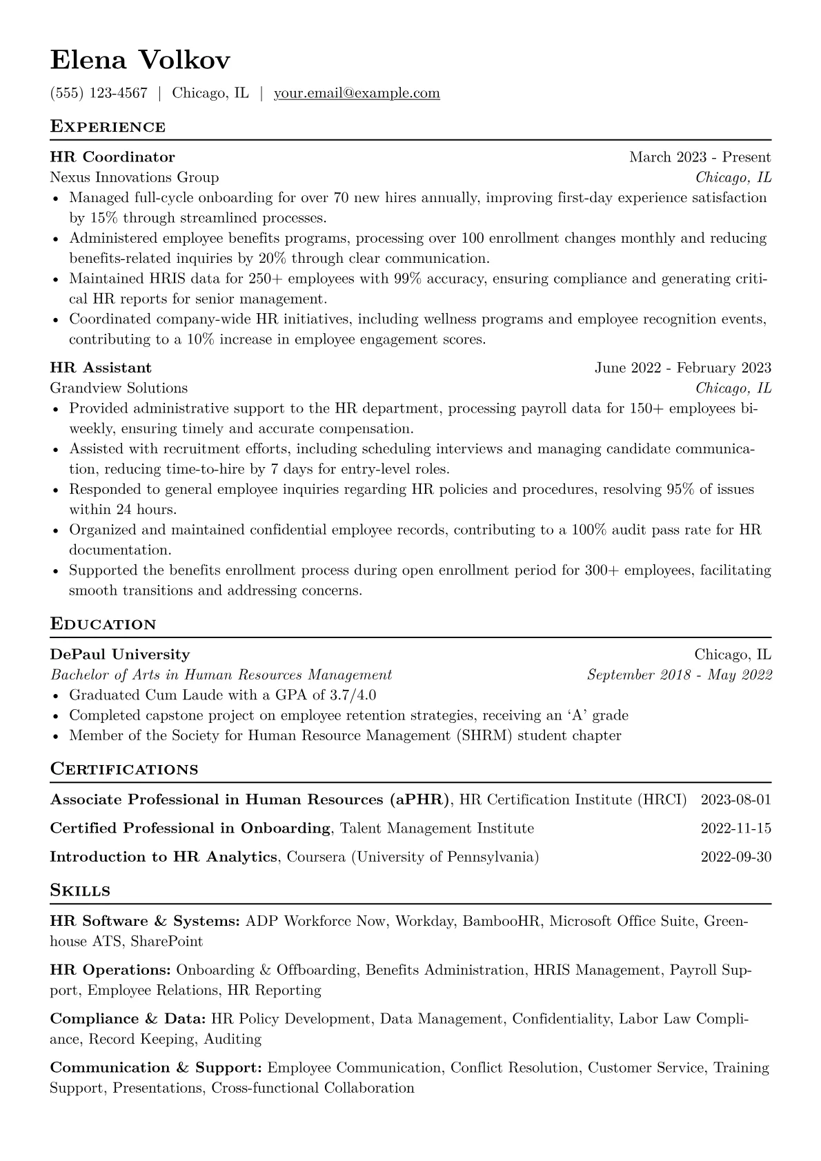 A strong HR Coordinator resume for entry-level roles emphasizes organizational prowess, meticulous data handling, and foundational HR process knowledge. Hiring managers seek evidence of supporting employee lifecycle activities, from streamlined onboarding processes to accurate record maintenance. Key achievements include quantifying volume of tasks managed, such as processing X new hires or updating Y employee files. Mentioning familiarity with HRIS platforms like Workday or ADP, along with any compliance coursework or certifications like aPHR, demonstrates readiness for the administrative and regulatory demands inherent in this essential support position.