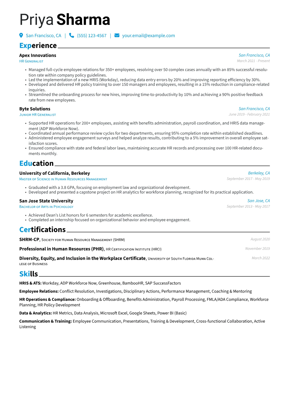 This HR Generalist example effectively highlights these critical elements. Achievements are concretely quantified, demonstrating tangible contributions like "reduced time-to-hire by 20% for X roles" or "managed Y employee relations investigations." The skills section is strategically grouped, separating "HRIS & Data Management" from "Employee Relations & Compliance" to showcase diverse capabilities. Proficiency in specific HR software, such as ADP Workforce Now and various applicant tracking systems, is clearly presented. This structure ensures a quick overview of both broad HR competencies and specialized operational experience.