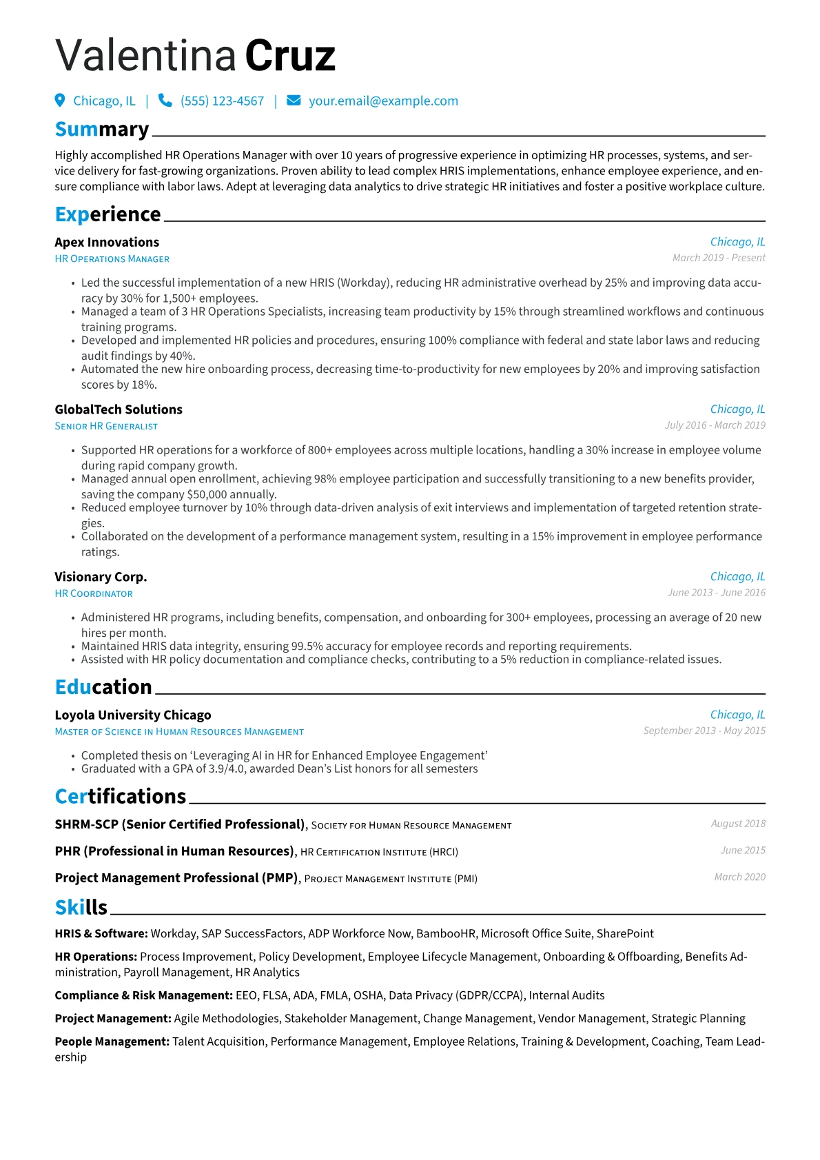 Hiring managers for senior HR Operations Managers in the "Other" industry seek candidates who drive efficiency and compliance across diverse HR functions. They specifically look for achievements in optimizing HRIS, streamlining payroll and benefits administration, and ensuring regulatory adherence like GDPR or specific labor laws. Experience with vendor management, implementing HR technology solutions such as Workday or ADP, and a strong grasp of data analytics to inform operational improvements are crucial. Certifications like SHRM-SCP or even PMP for project leadership demonstrate advanced capabilities.
