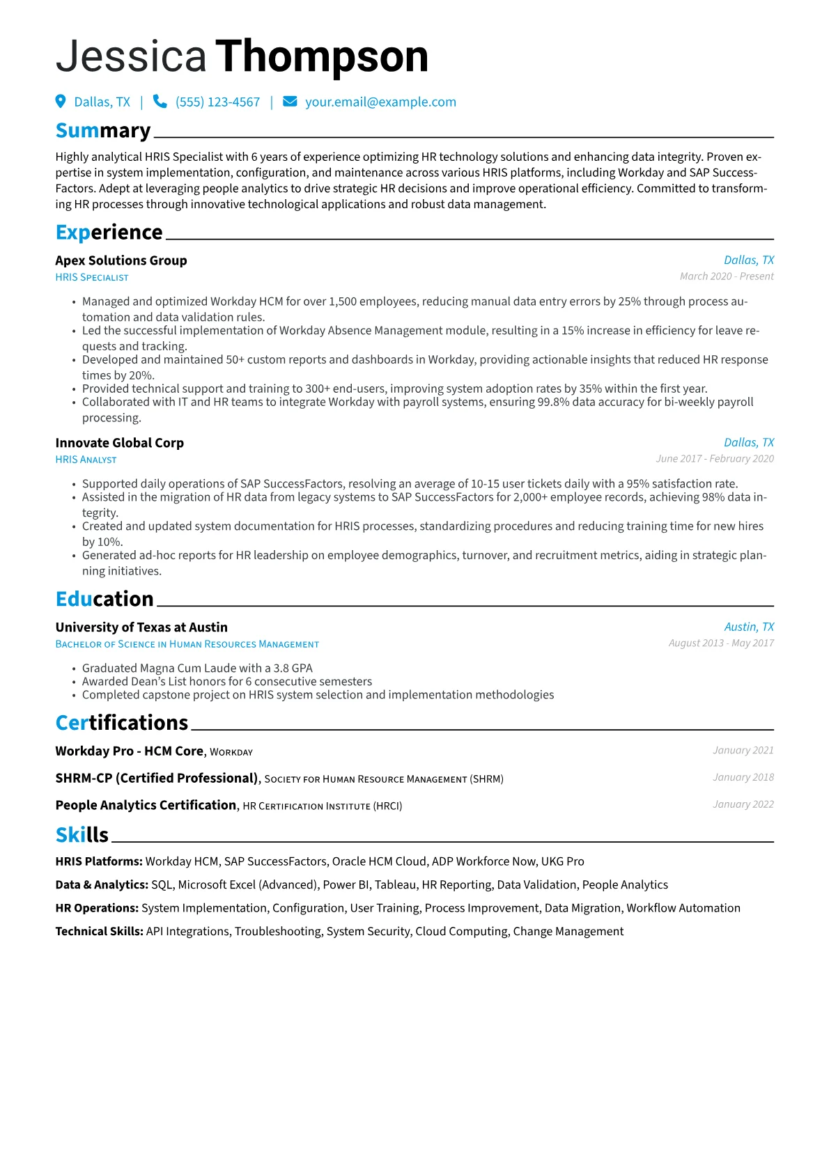A strong mid-level HRIS Specialist resume, particularly in a non-sector-specific "Other" industry context, focuses on quantifiable achievements and platform mastery. Hiring managers specifically seek evidence of system configuration, data integrity management, and process optimization. Concrete examples include having successfully implemented or upgraded HRIS modules, improving reporting efficiency through custom dashboards, or reducing manual data errors by a measurable percentage. Terminology like "system architecture," "API integration," "data governance," and specific platform names such as Workday, SAP SuccessFactors, or Oracle HCM Cloud are crucial.