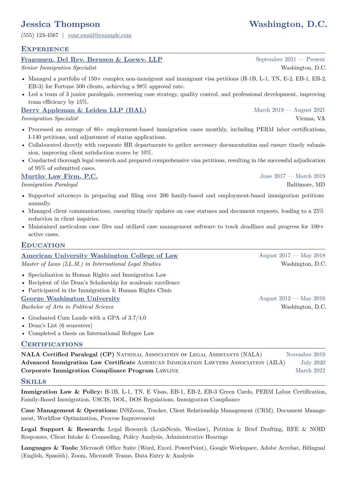 For an Immigration Specialist resume, hiring managers in the "Other" industry—such as corporate HR departments—seek candidates who demonstrate strong regulatory compliance, efficient case management, and clear communication skills. The unique challenge lies in balancing complex, evolving legal requirements with the need to support internal talent acquisition and retention goals. A compelling resume showcases a candidate's ability to navigate these intricacies while ensuring a seamless experience for international employees.