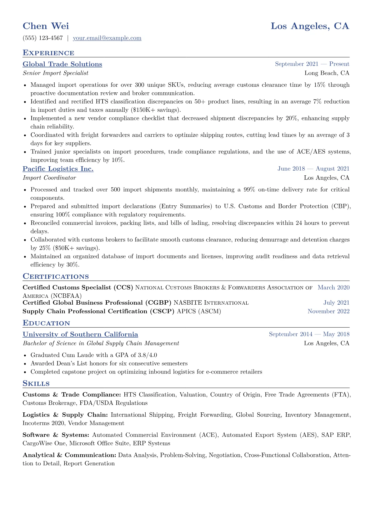 This JobSprout example effectively showcases these qualities by featuring clearly quantified achievements that highlight process improvements and cost savings. Its well-organized skills section groups relevant proficiencies like HTS classification, incoterms, and customs brokerage software, making key qualifications immediately apparent. The inclusion of pertinent certifications further reinforces the candidate's expertise and commitment to professional standards.