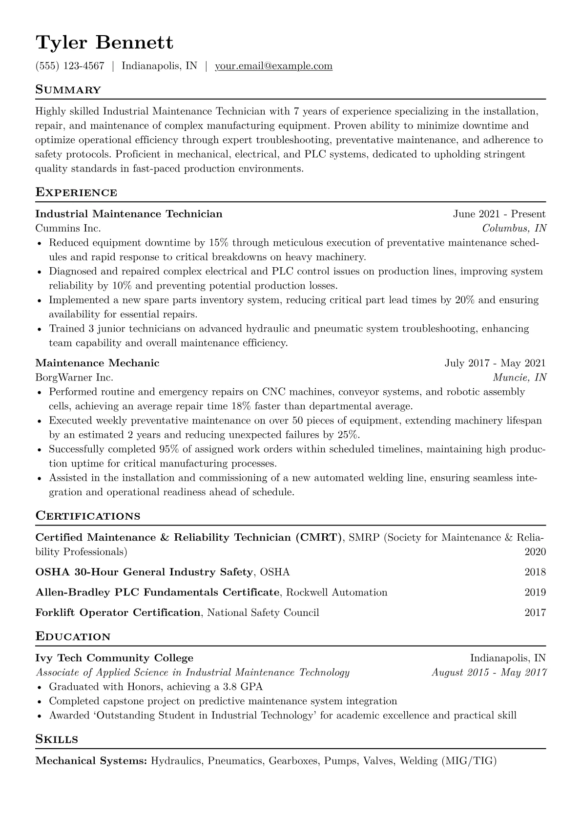 This template was built using JobSprout’s professional CV builder and can be easily remixed to create your own tailored Industrial Maintenance Technician resume, highlighting your unique expertise.