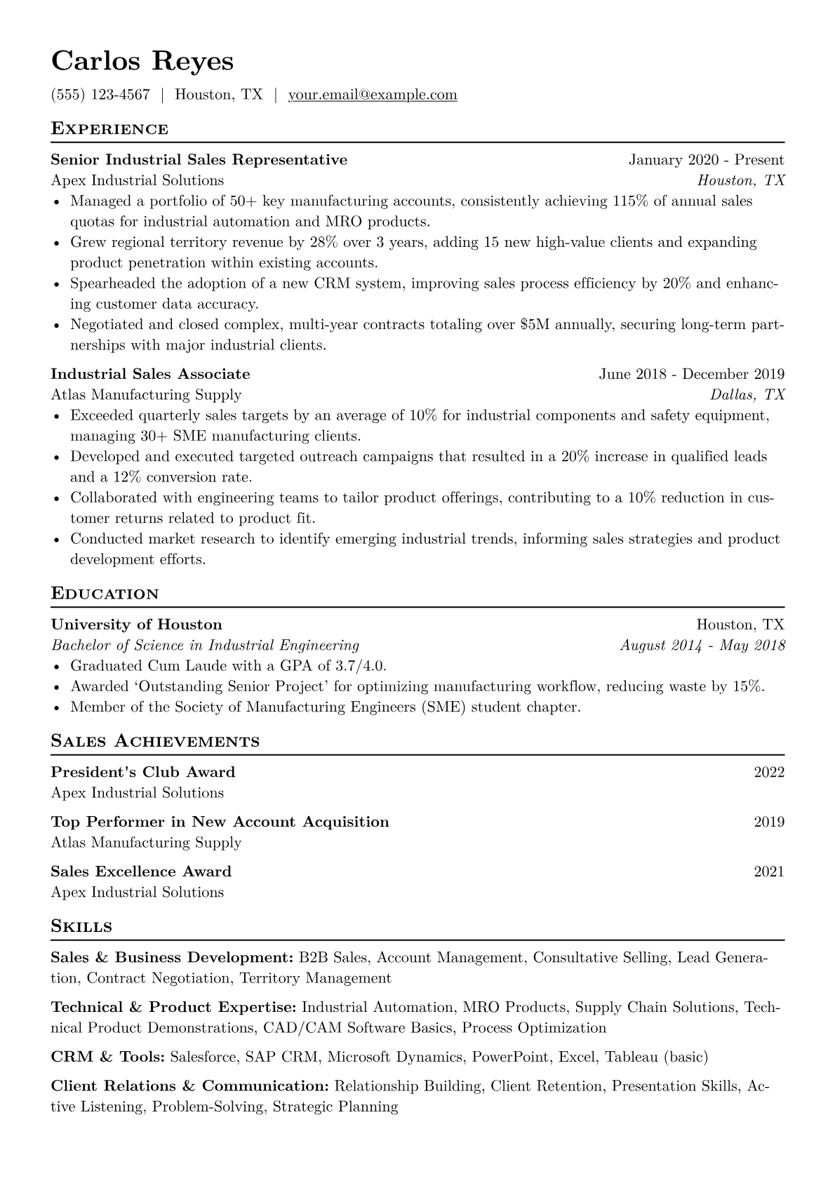 A compelling Industrial Sales Representative resume for the manufacturing sector highlights a candidate's ability to drive revenue and manage complex B2B relationships. Hiring managers seek clear evidence of quota attainment, technical aptitude for industrial products, and proficiency in navigating long sales cycles. The unique challenge lies in demonstrating both sales acumen and an understanding of highly specialized product lines.