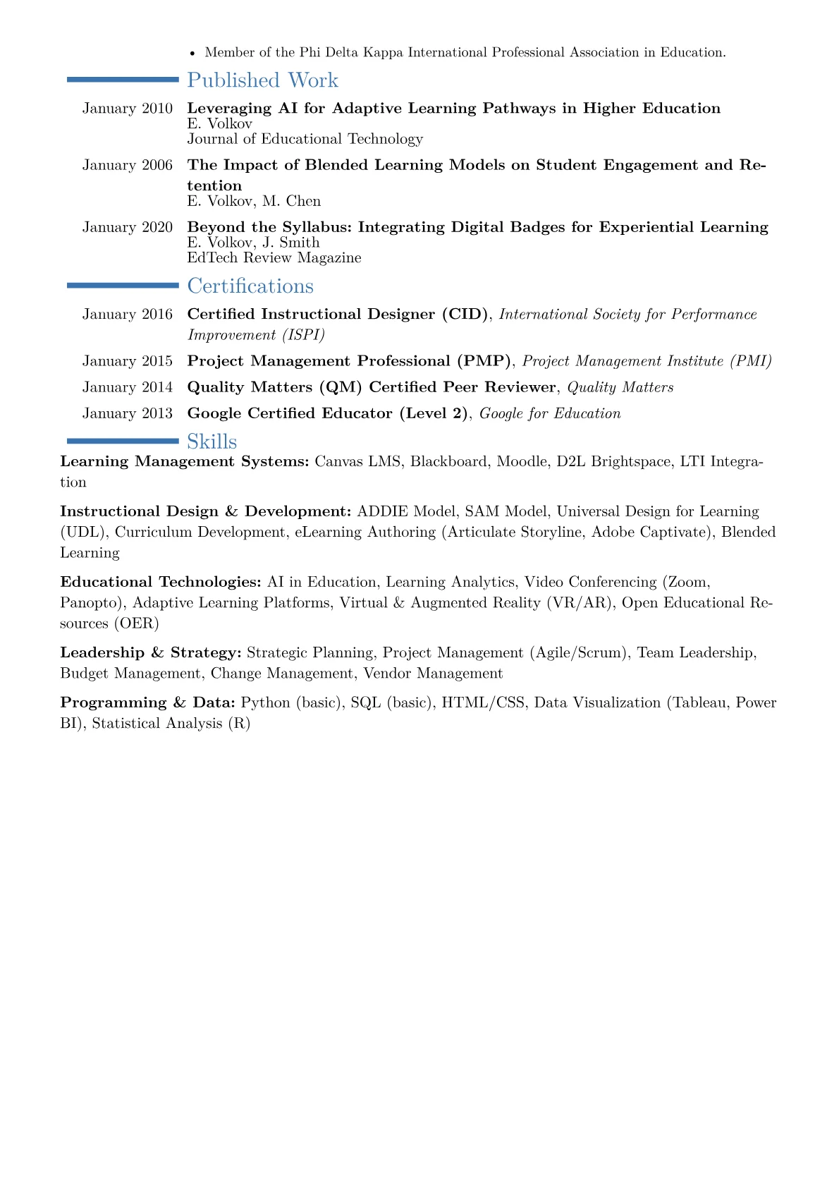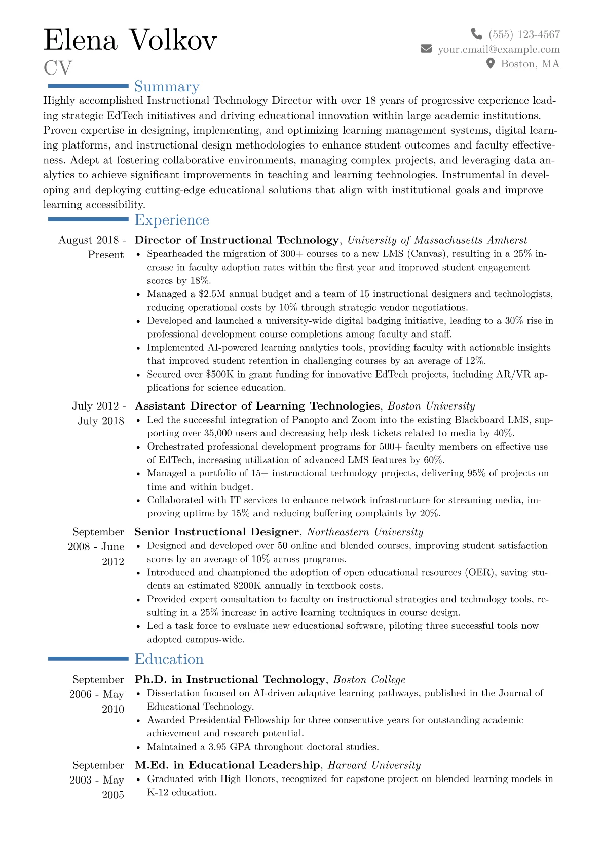 This example CV excels by concretely quantifying its achievements, demonstrating impact beyond just responsibilities. For instance, it details how the director "orchestrated a 25% reduction in IT operational costs through strategic vendor consolidation" and "improved faculty digital literacy by 35% through targeted professional development." Skills are effectively grouped under relevant headings such as "Strategic Technology Leadership," "Digital Learning Ecosystem Management," and "IT Governance & Compliance," which immediately highlights executive competencies. Key certifications like CETL and fluency in platforms such as Canvas, Moodle, and specific project management tools are prominently featured, assuring employers of practical expertise.