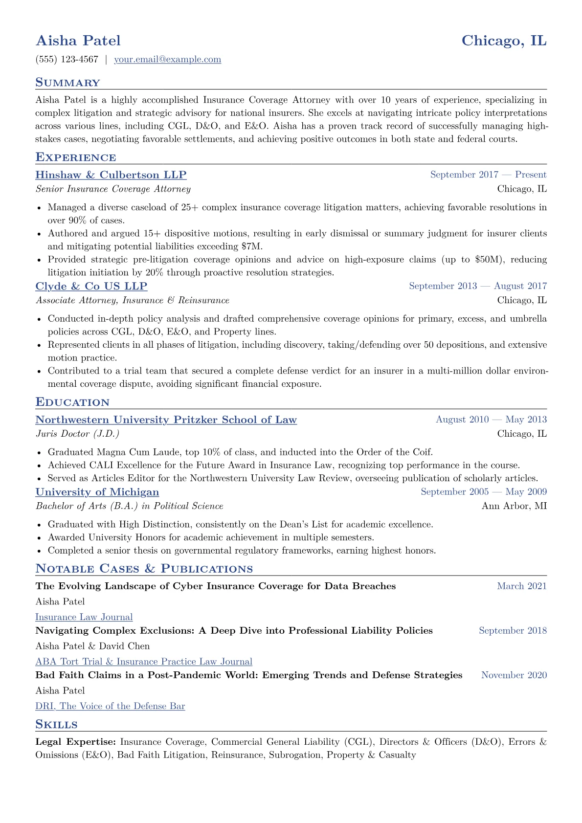 For a senior Insurance Coverage Attorney, a compelling resume highlights specialized expertise in policy analysis and litigation. Hiring managers seek demonstrable experience with complex coverage disputes across various policy types, such as CGL, D&O, E&O, and professional liability. Concrete achievements should include successful declaratory judgment actions, favorable settlements of bad faith claims, and precise interpretation of intricate policy exclusions, directly impacting client exposure or recovery. Proficiency with specific state insurance regulations, appellate work, and knowledge of emerging risks like cyber liability coverage are also critical indicators of a strong candidate. Bar admissions and relevant professional affiliations should be prominently displayed.