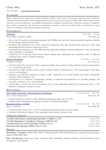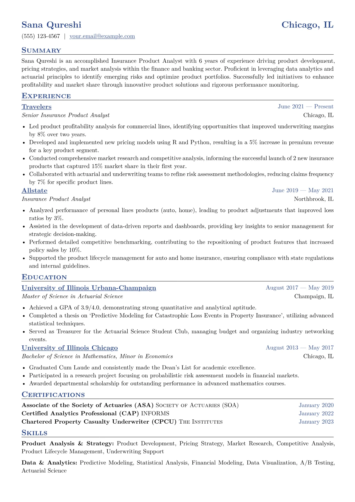 The featured resume expertly showcases these nuances. Achievements are consistently quantified, illustrating impact like "reduced policy churn by 10% through enhanced product segmentation" or "analyzed market trends to inform pricing adjustments for a $50M portfolio." Technical skills are clearly delineated, grouping analytical tools such as SAS or Tableau alongside specific insurance product knowledge like P&C or Annuities. The prominent placement of industry certifications, such as a CPCU designation, immediately communicates specialized expertise to a recruiter.
