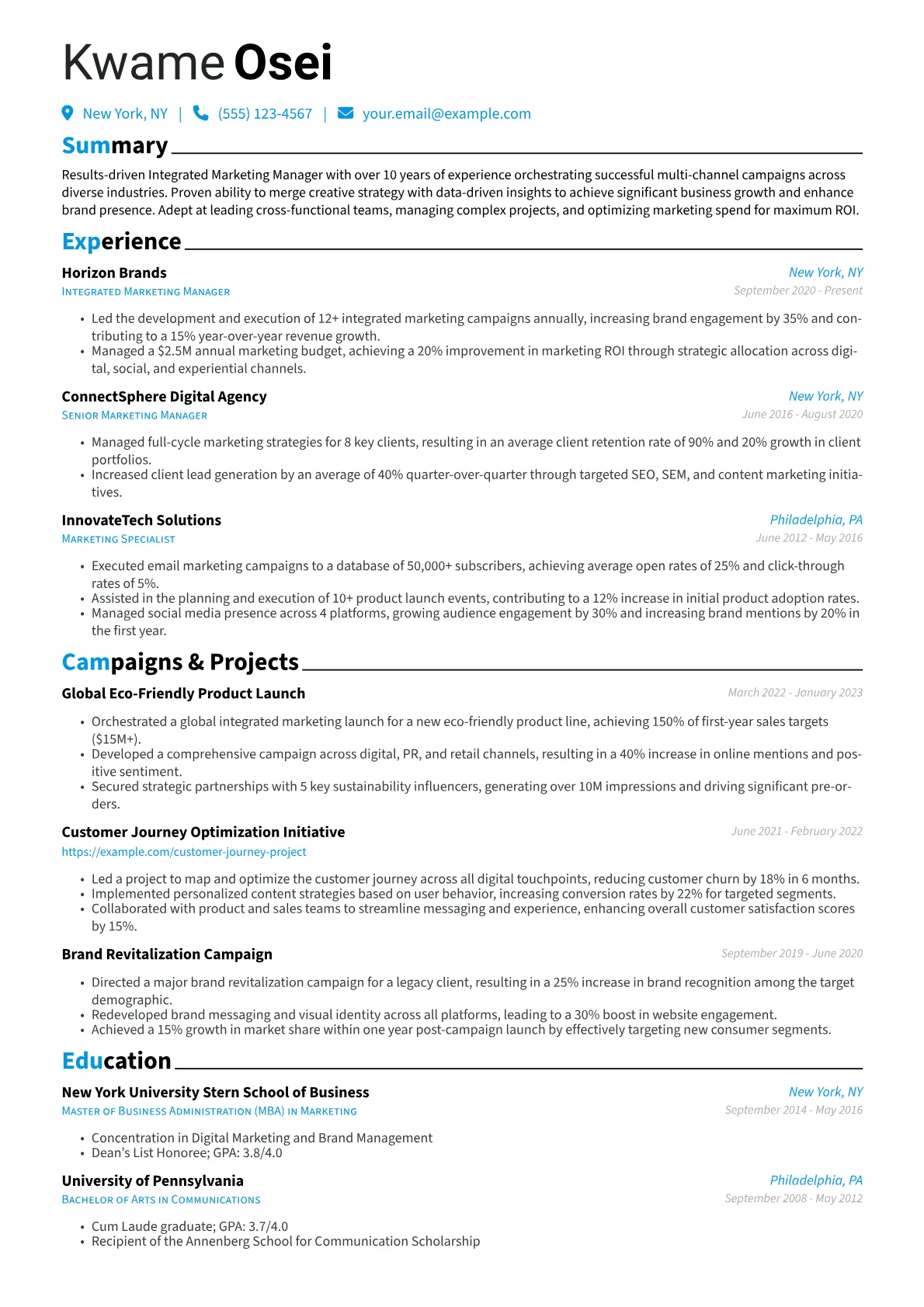 An Integrated Marketing Manager resume in the Marketing & Advertising industry must detail a clear impact on business objectives through cohesive, multi channel strategies. Hiring managers look for concrete achievements in areas like lead generation, conversion rate optimization, and customer acquisition cost reduction. Demonstrable experience with customer journey mapping, attribution models, and martech stack optimization is crucial. Highlighting specific industry certifications such as Google Ads, HubSpot Inbound Marketing, or Salesforce Marketing Cloud further reinforces a candidate's practical expertise and strategic capabilities in this dynamic role.