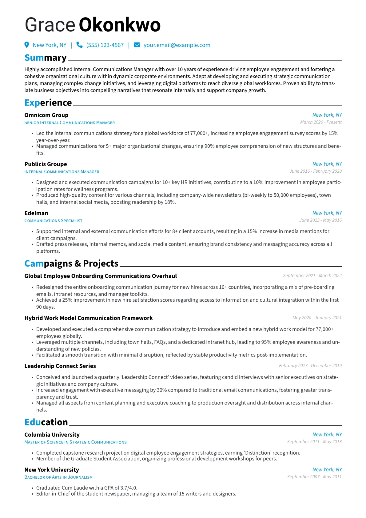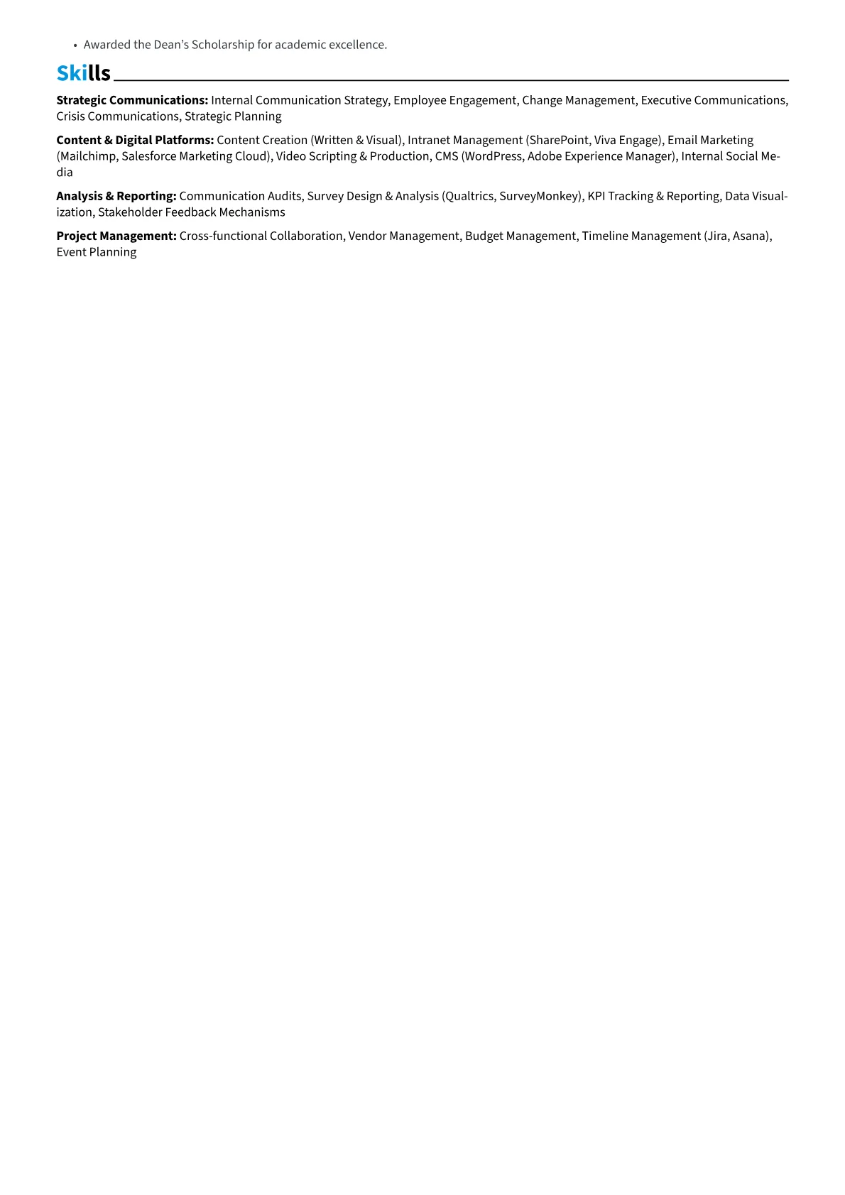 The example CV effectively structures these elements to highlight a candidate's strengths. It quantifies achievements, such as "increased employee participation in internal campaigns by 30%" or "reduced communication-related queries by 25%." Skills are grouped logically, separating strategic planning from content creation and platform management. Crucially, the resume details proficiency with tools vital to the role, like intranet systems, employee advocacy platforms, or specific HRIS integrations for communication. This specificity ensures relevance for an Internal Communications Manager, emphasizing both strategic leadership and practical execution.