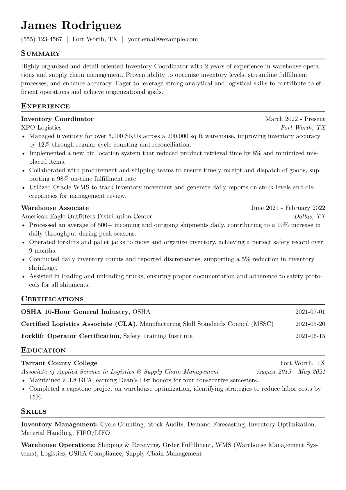 The JobSprout example effectively highlights these critical elements for an Inventory Coordinator. Achievements are quantified, stating specific accuracy rates or the volume of items managed, showcasing tangible impact even for entry-level experience. Skills are intelligently grouped, clearly separating technical proficiencies like WMS software and Microsoft Excel from essential soft skills such as problem-solving and organization. Furthermore, key certifications, including forklift operation or basic supply chain modules, are prominently featured, reassuring employers of immediate practical capabilities. The resume's structure directs recruiters to relevant operational experience and tools.