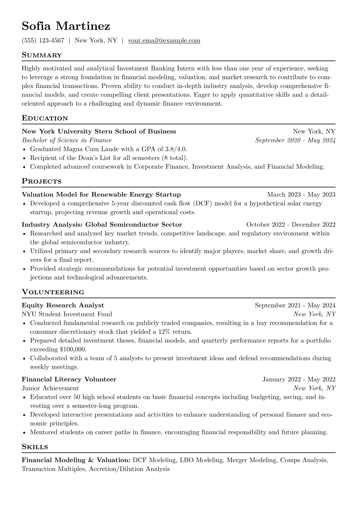 Securing an Investment Banking Intern role demands a resume that speaks directly to the industry's rigorous expectations. Hiring managers seek clear evidence of analytical prowess, quantitative acumen, and a deep interest in financial markets. Ideal candidates showcase strong academic performance, particularly in finance, economics, or quantitative fields, along with practical application of skills through investment clubs, case competitions, or personal projects. Specific achievements to highlight include experience with financial modeling, valuation methodologies (e.g., DCF, comparable company analysis), and proficiency in tools like advanced Excel, PowerPoint, and Bloomberg Terminal, demonstrating a foundational understanding of the deal lifecycle.