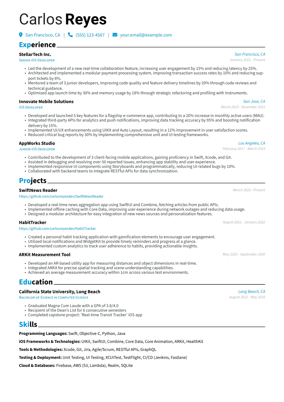This well-structured template was built using JobSprout's powerful tools, offering a solid foundation you can easily remix to craft your own compelling iOS Developer resume.