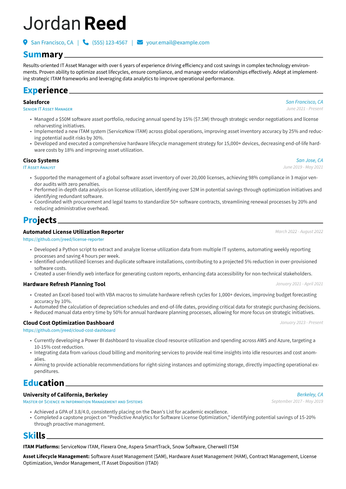 This example resume effectively showcases an IT Asset Manager's capabilities by quantifying key accomplishments. It adeptly groups technical proficiencies, clearly separating software asset management tools like Flexera from hardware lifecycle skills. Certifications, such as ITIL, are prominently displayed, assuring employers of foundational knowledge. The resume highlights specific projects where the candidate contributed to successful software audits or optimized license utilization, directly addressing common industry challenges. The emphasis on tangible outcomes, like reducing licensing overspend, makes this a compelling example.