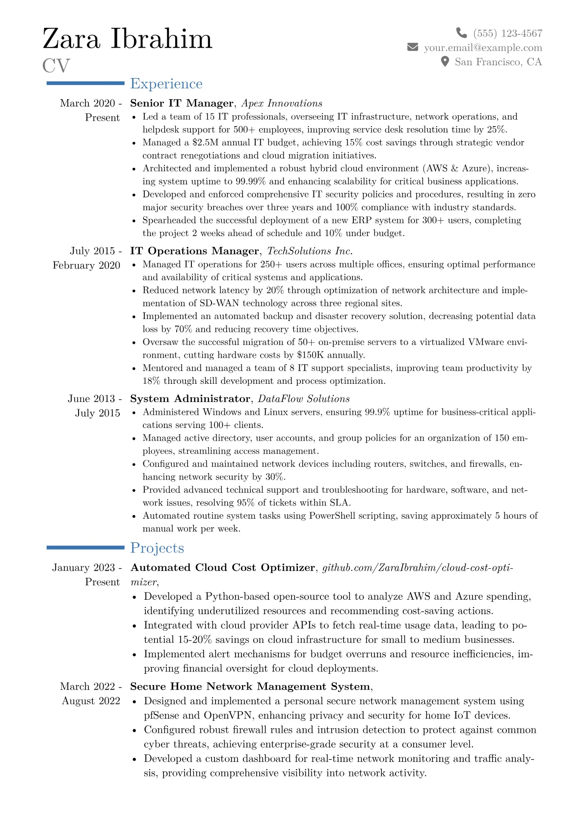 This JobSprout example effectively highlights critical competencies through its structured approach. It features a prominent "Key Achievements" section that uses quantified metrics to showcase significant improvements in system uptime and cost savings. Additionally, the clear grouping of technical skills, such as cloud platforms and cybersecurity, alongside essential certifications like ITIL and PMP, provides an immediate snapshot of the candidate's comprehensive expertise.
