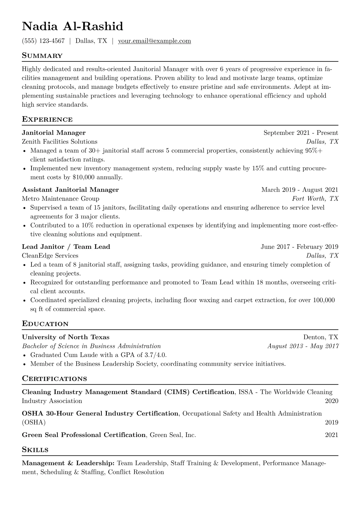 This template was built with JobSprout and can be remixed to create your own tailored Janitorial Manager resume.