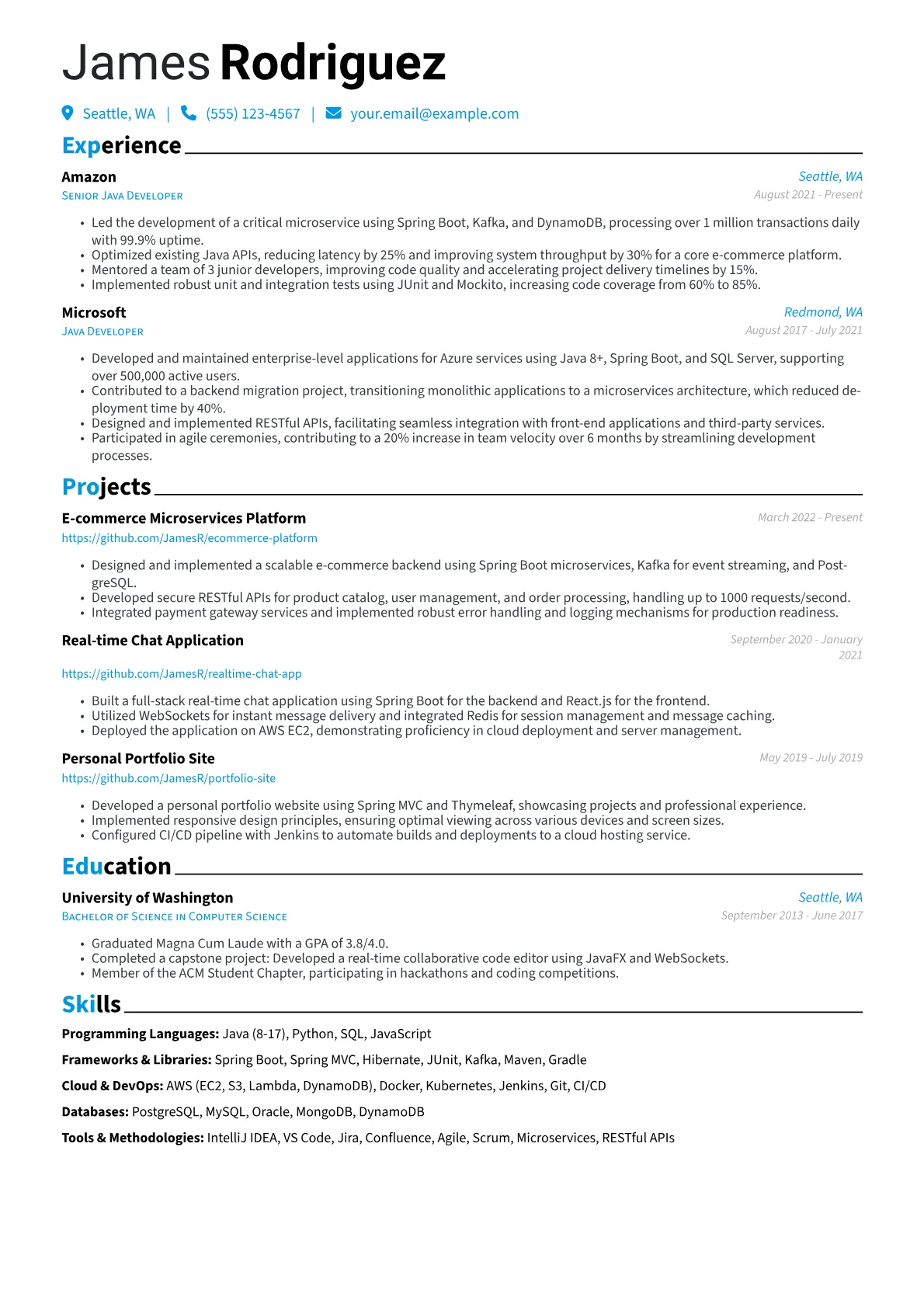 This robust template was expertly designed within JobSprout's professional CV builder. Aspiring Java Developers can easily remix this example to tailor it with their specific experience and showcase their unique qualifications.
