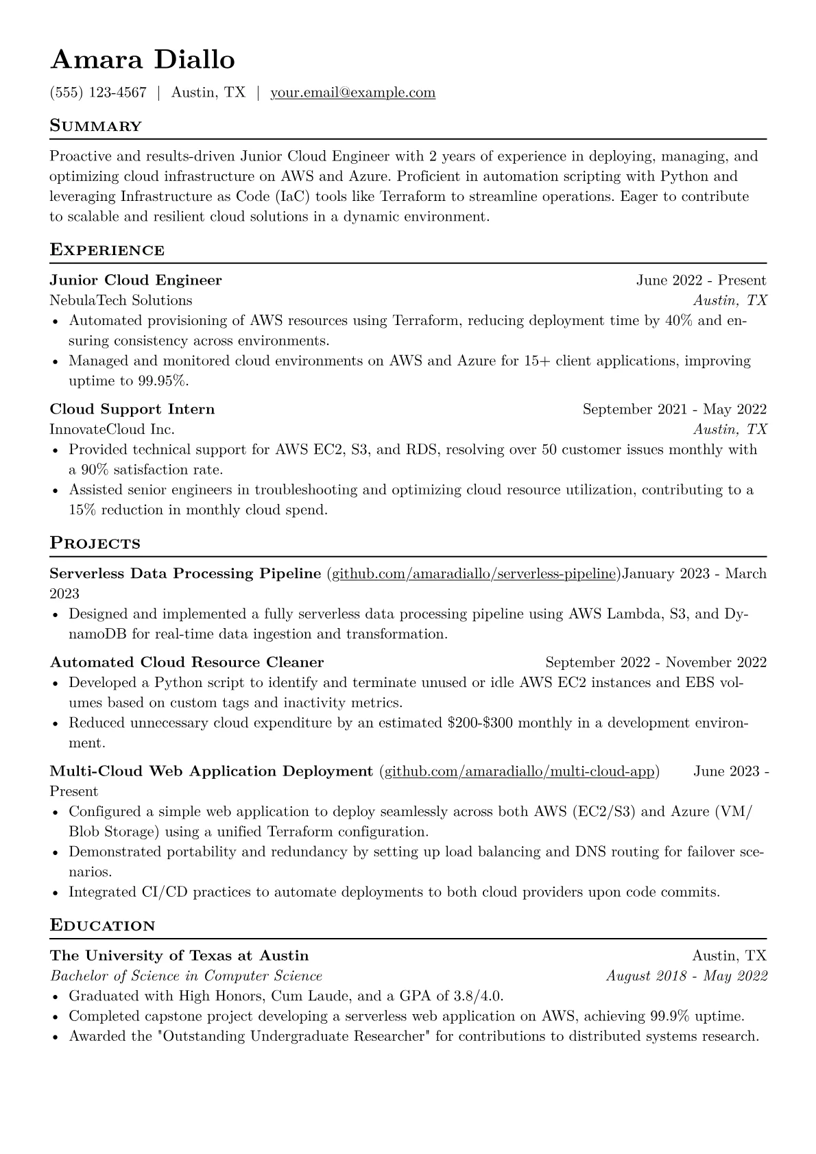 This template was built with JobSprout and can be remixed to create your own tailored Junior Cloud Engineer resume.