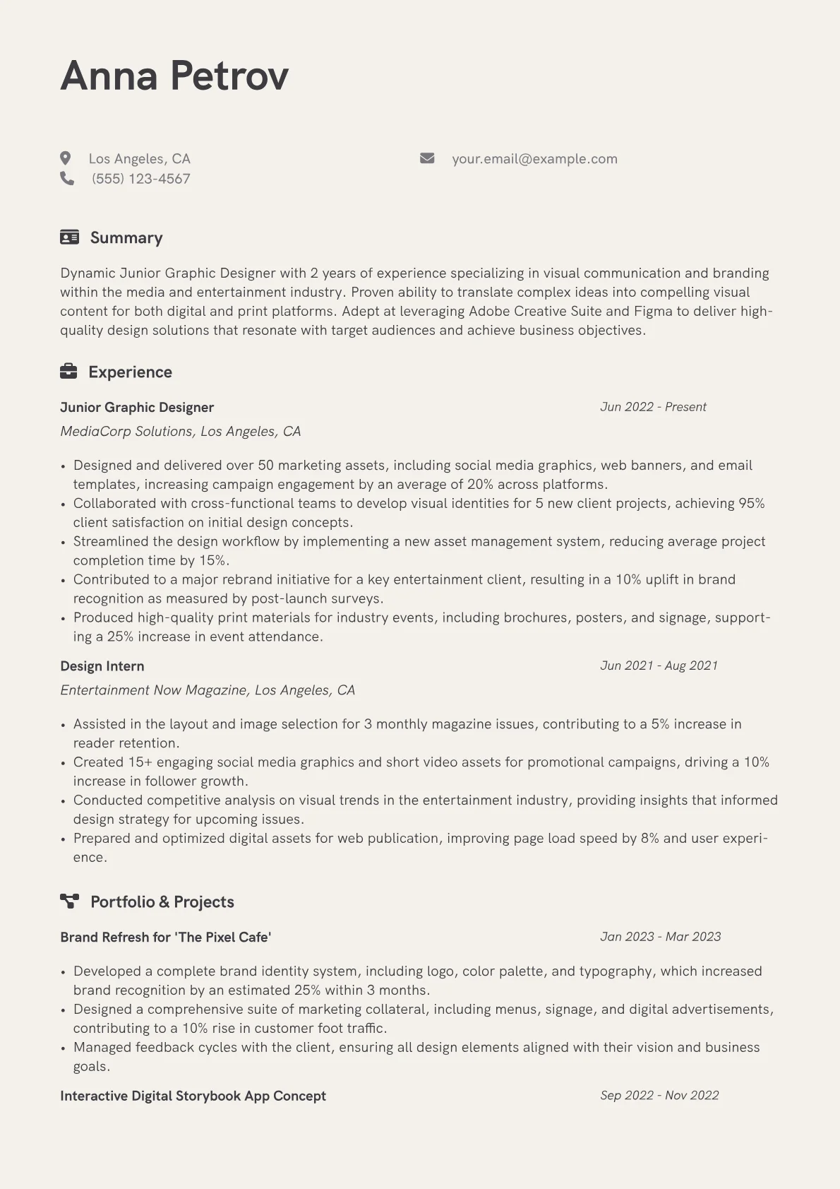This template was built with JobSprout and can be remixed to create your own tailored Junior Graphic Designer resume. It provides a solid framework for showcasing your unique design journey.