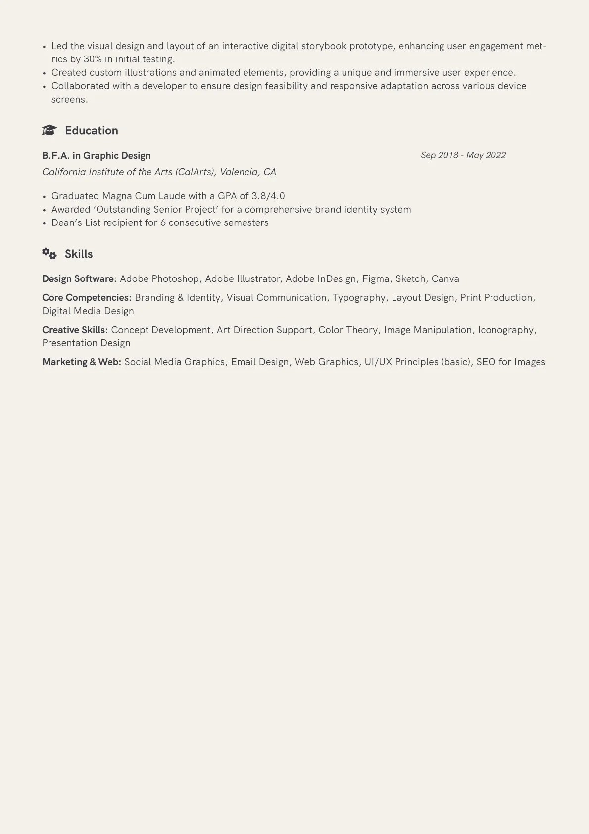 The JobSprout example effectively addresses these needs by prominently featuring a portfolio link, essential for visual roles. Its structure clearly separates "Technical Skills" into specific software proficiencies like Figma and the Adobe Creative Suite, critical for this industry. Project descriptions detail measurable contributions, such as "designed responsive UI components for a student-developed mobile game," even for entry-level experiences. This approach clearly demonstrates design process understanding and the ability to contribute to creative teams.