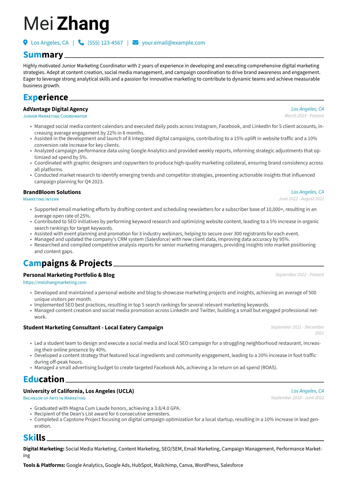 This template was built with JobSprout and can be remixed to create your own tailored Junior Marketing Coordinator resume.
