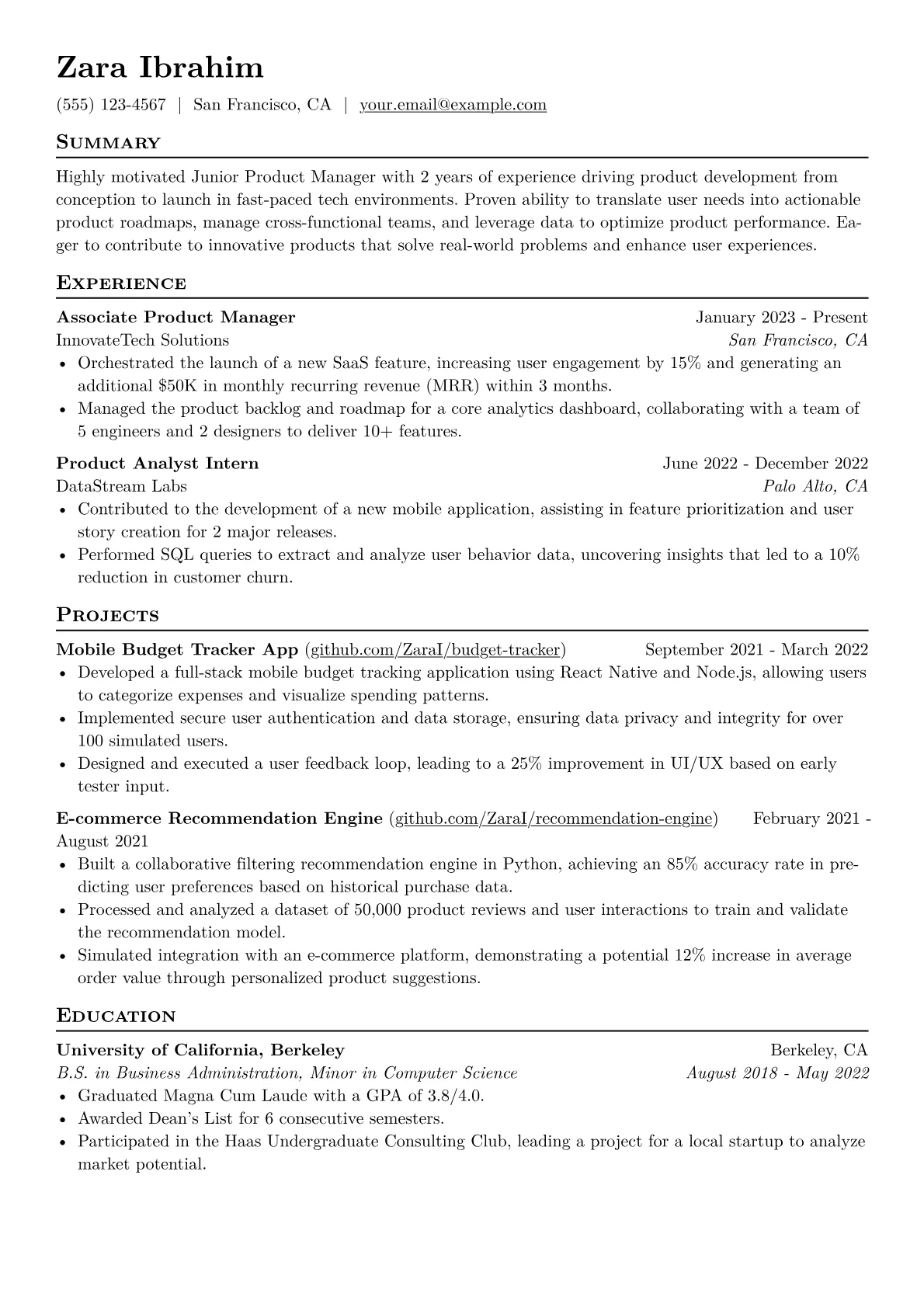 This template was built with JobSprout and can be remixed to create your own tailored Junior Product Manager resume.