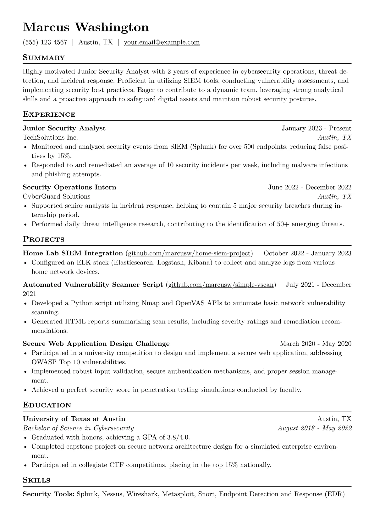 This template was built with JobSprout and can be remixed to create your own tailored Junior Security Analyst resume.