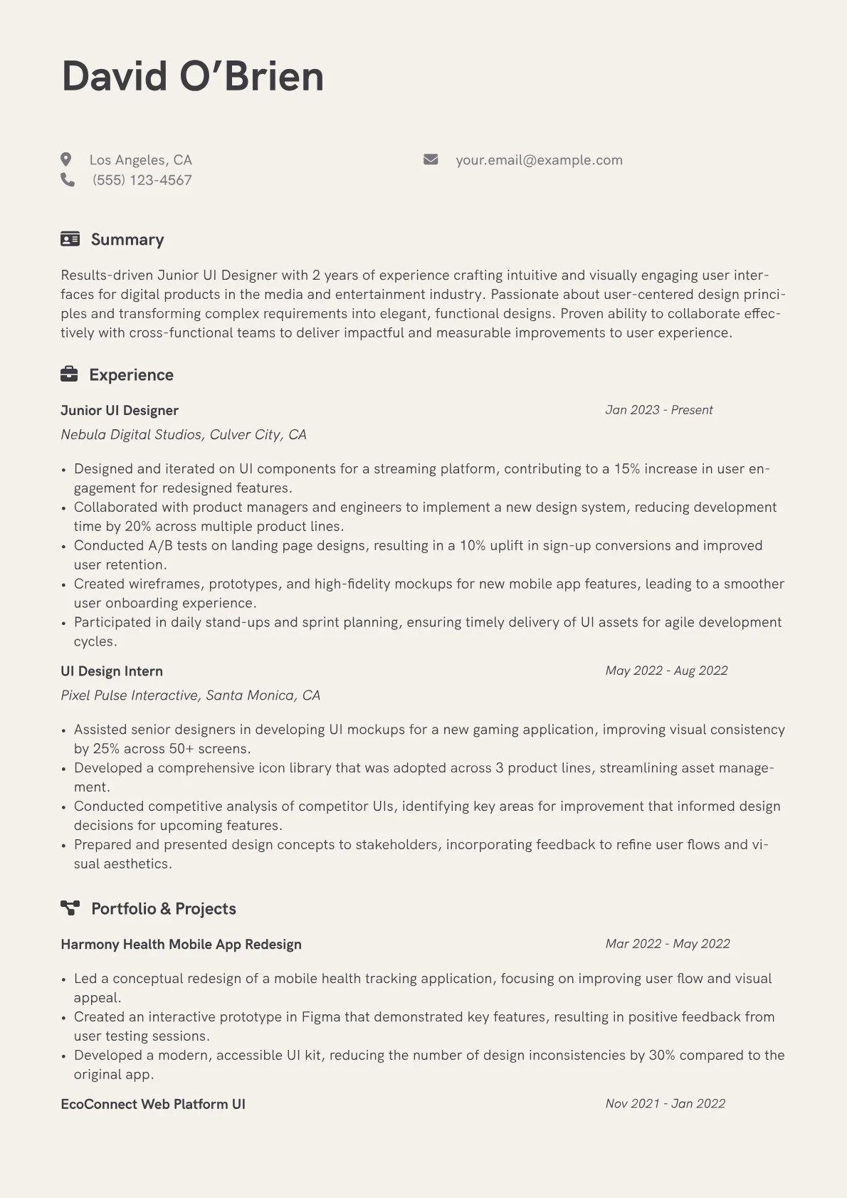 This template was built with JobSprout and can be remixed to create your own tailored Junior UI Designer resume. Leverage its structure to showcase your unique skills and projects effectively.