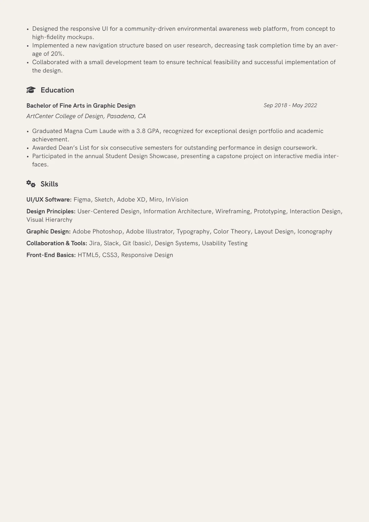 This example CV effectively highlights a junior designer's potential by strategically structuring key information. It groups technical proficiencies clearly, separating 'Design Software' (e.g., Figma, Adobe XD) from 'Prototyping & Collaboration Tools' (e.g., InVision, Jira). Achievements are presented with specific impact, such as "Redesigned a university project's navigation, improving task completion rates by 15%." Critically, it prominently features a portfolio link and briefly describes project contributions, even for entry-level roles, demonstrating an understanding of the design process from ideation to visual execution.