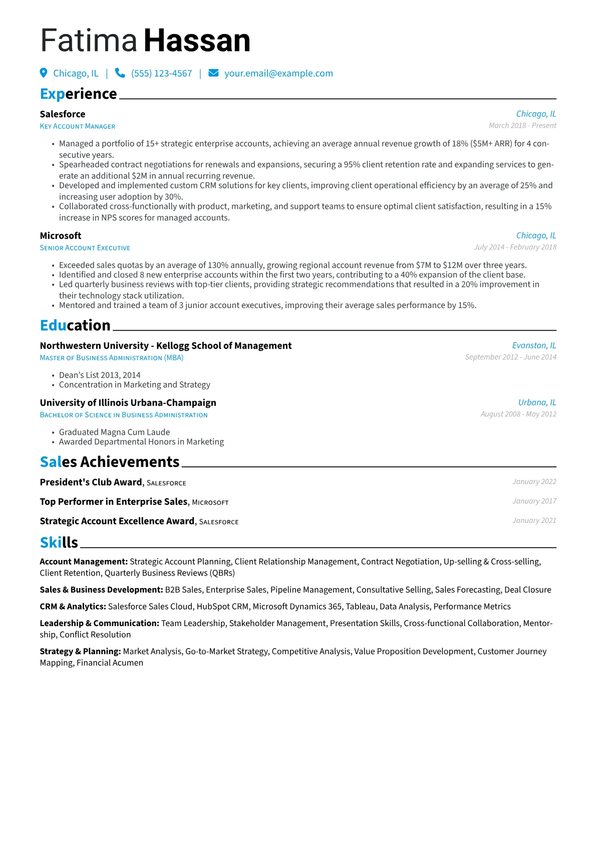 A strong Key Account Manager resume emphasizes quantifiable impact on revenue growth, client retention, and strategic partnership development. For hiring managers in the "Other" industry, demonstrating adaptability across diverse client portfolios, strong cross-functional collaboration skills, and the ability to navigate complex sales cycles are paramount. The unique challenge lies in showcasing strategic influence beyond transactional sales and managing varied client expectations effectively.
