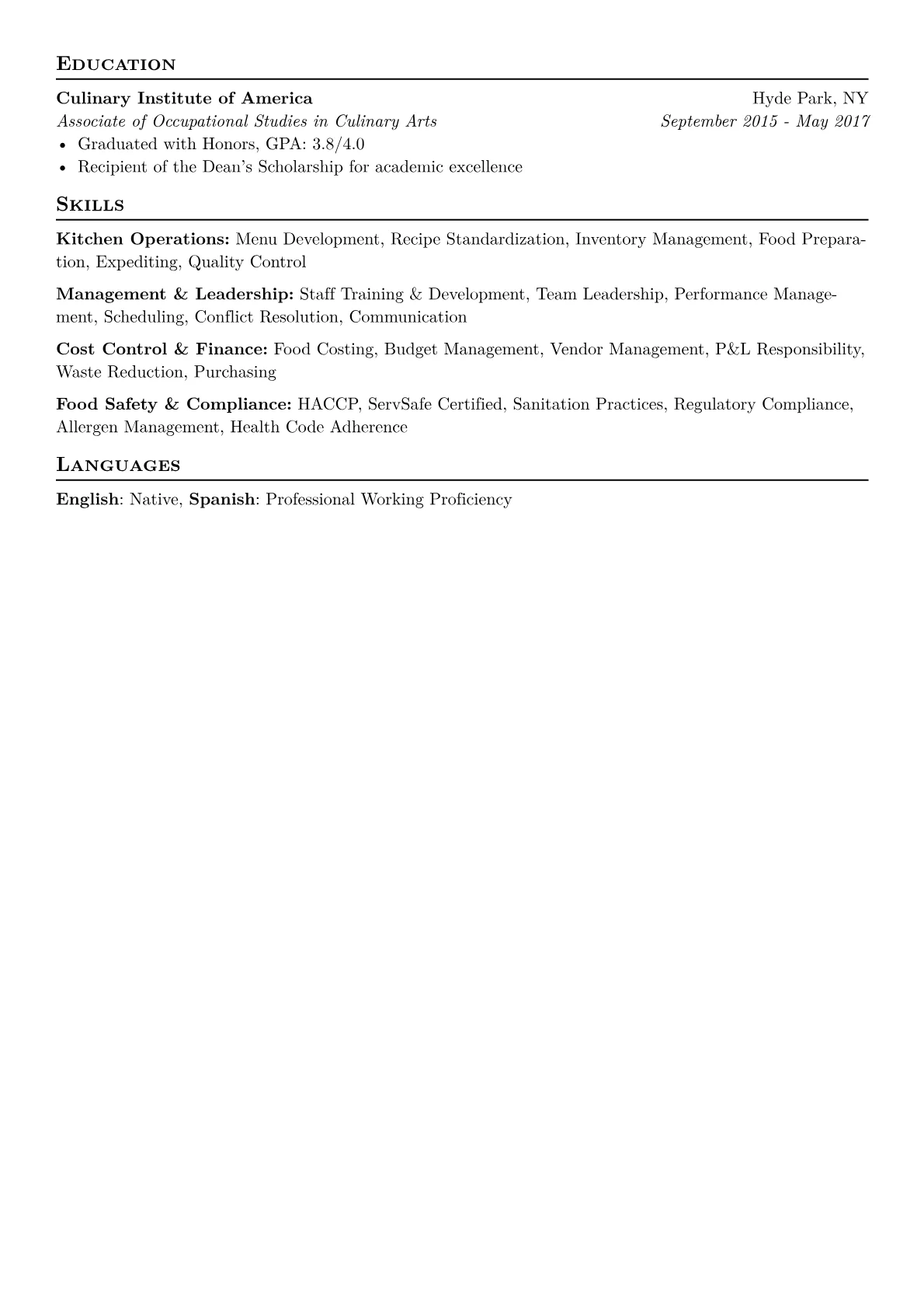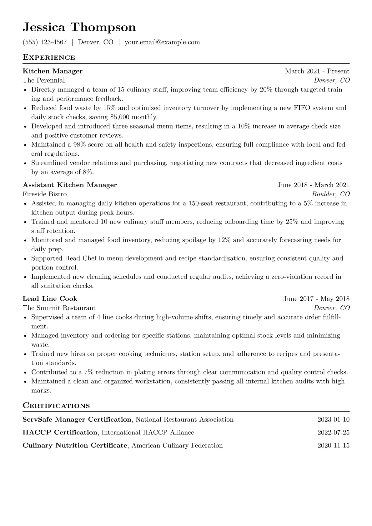 This well-crafted template was built using JobSprout's builder and can be easily remixed to create your own compelling Kitchen Manager resume.