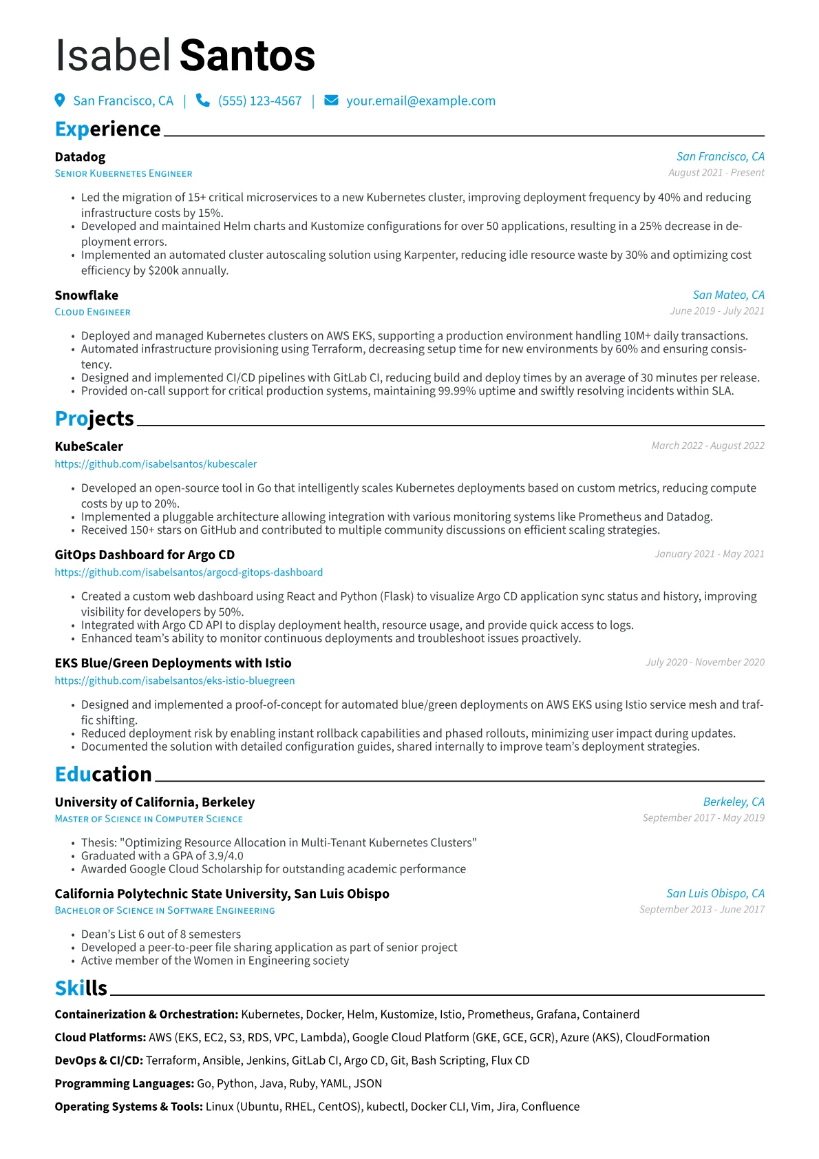 This powerful template was built with JobSprout and can be easily remixed to create your own compelling Kubernetes Engineer resume.