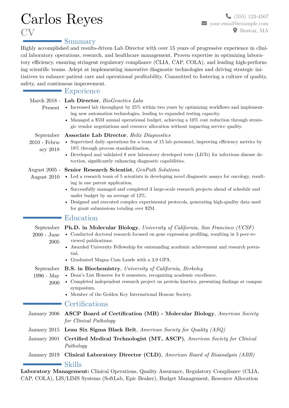This template was built using JobSprout and offers a robust framework for crafting a compelling Lab Director resume. It can be easily customized to reflect unique accomplishments and expertise.