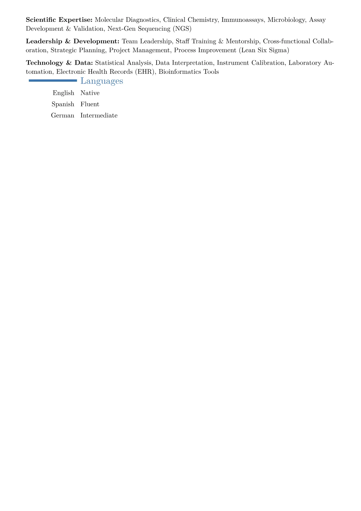 Hiring managers seeking a Lab Director in Healthcare prioritize a candidate's demonstrated expertise in regulatory compliance, quality assurance, and operational efficiency. Resumes must showcase achievements like successful CAP and CLIA accreditations, significant improvements in assay development, or reductions in turnaround times while maintaining diagnostic accuracy. Specific certifications such as ASCP MLS(CM) or a PhD in a relevant scientific discipline are crucial, alongside proficiency in LIS systems and deep understanding of clinical laboratory best practices. The role demands strong leadership in managing complex teams and navigating evolving healthcare regulations.