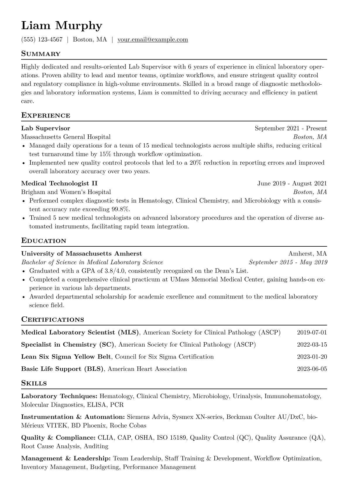 This example CV effectively highlights these critical aspects by quantifying accomplishments like "streamlined workflow, reducing sample processing time by 10%." Technical skills, such as molecular diagnostics or immunoassay, are clearly separated from leadership competencies like "staff training and mentorship." Certifications, including ASCP MLS, are prominently featured, assuring recruiters of foundational qualifications. The resume also details proficiency with specific laboratory instrumentation and LIS platforms, directly addressing the practical demands of a clinical lab environment. This structured approach makes key information immediately accessible to hiring managers.