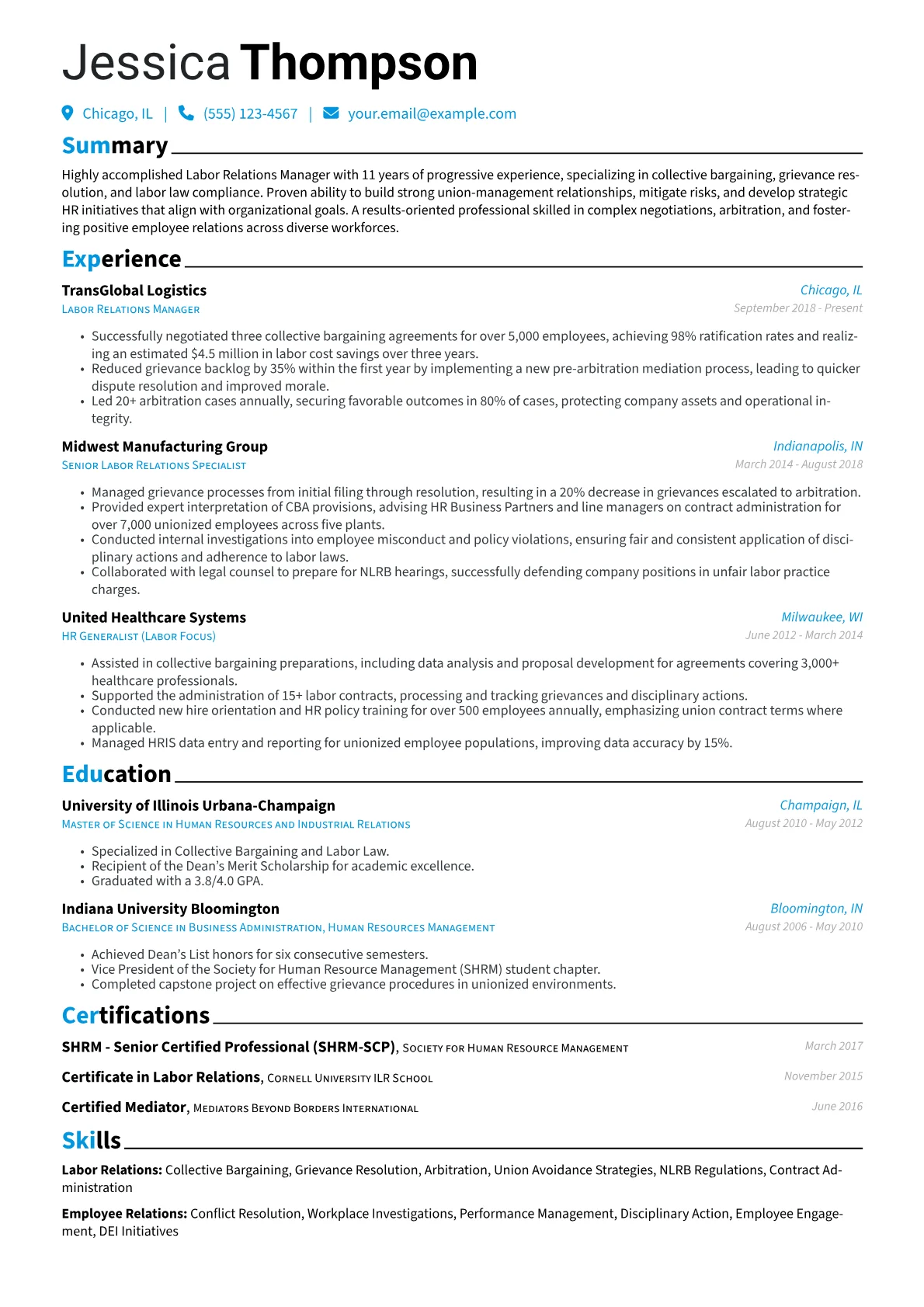 This example resume excels by quantifying specific labor relations achievements, such as reducing arbitration cases by a measurable percentage or achieving significant cost savings in contract renewals. It effectively groups critical skills like "Collective Bargaining and Negotiation," "Grievance and Arbitration Management," and "Labor Law Compliance" to provide immediate clarity. Crucially, any relevant certifications, like Certified Labor Relations Professional or advanced mediation training, are prominently highlighted, alongside expertise in HRIS platforms with labor module integration.